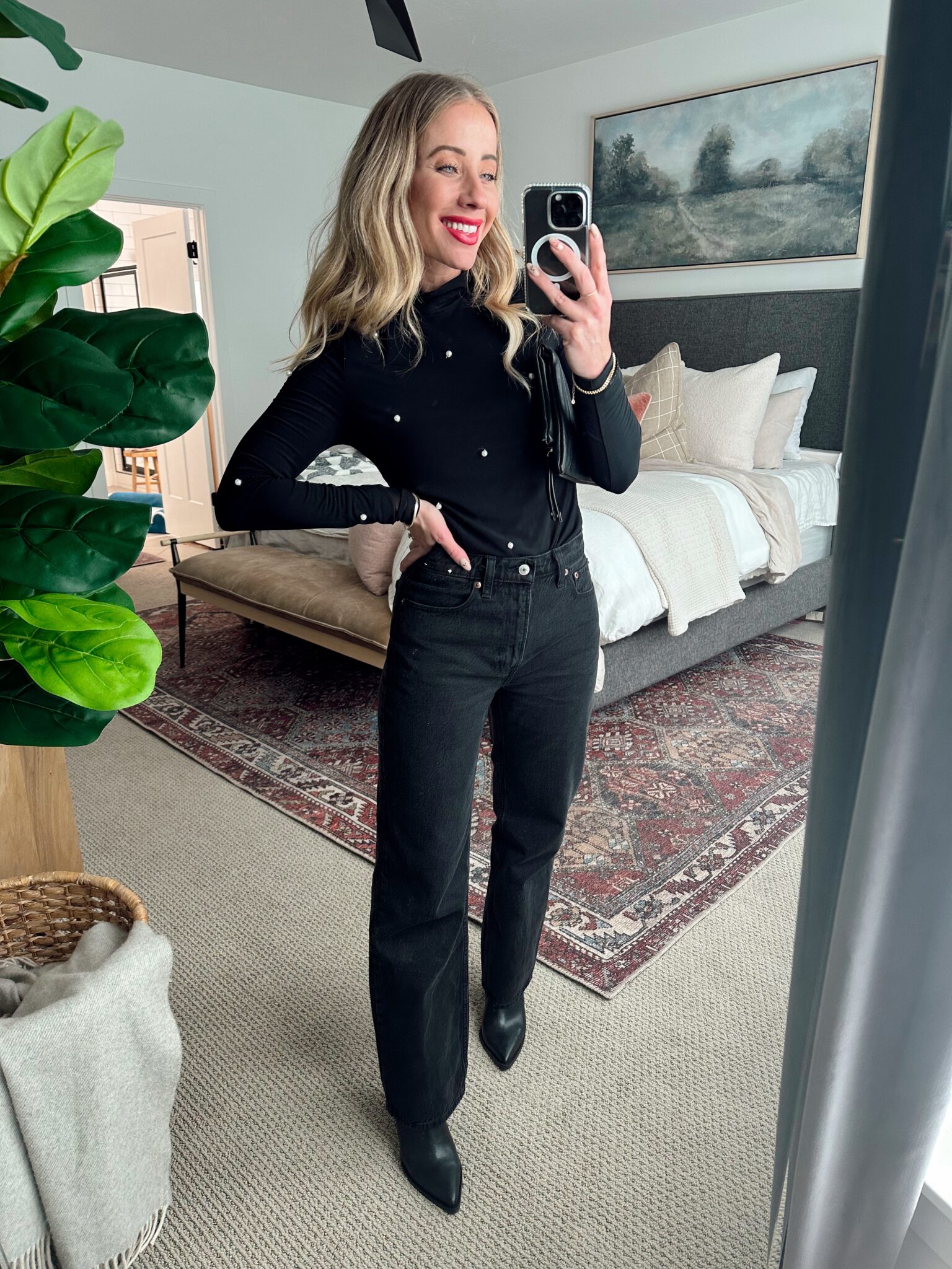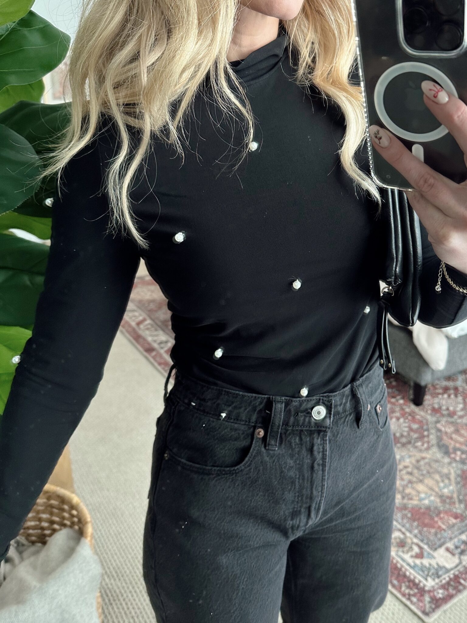 Last, but not least – this semi sheer pearl long sleeve top! I love how dressy it is, but still casual and cute! I wore it to a christmas party with jeans like this, and I think it’d be so cute tucked into a midi or maxi skirt too!