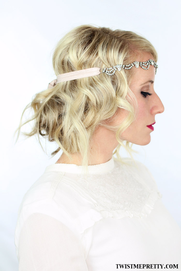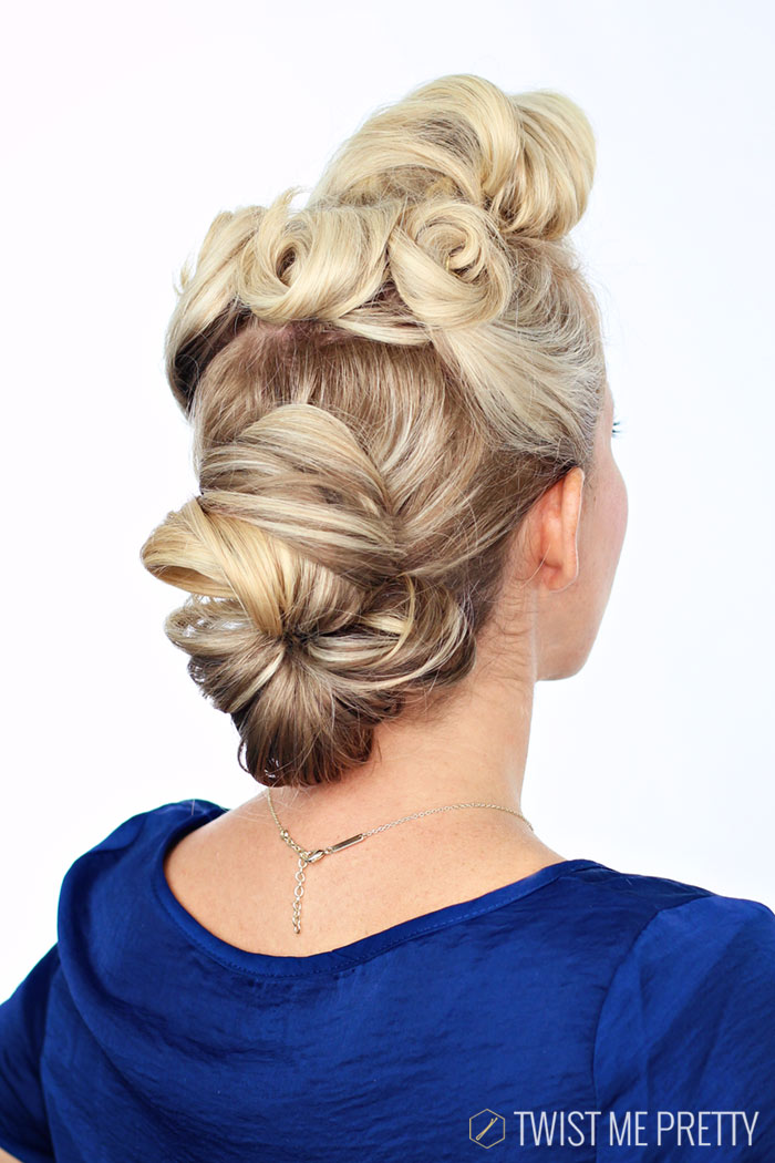 This hairstyle and the next one are 50’s hacks — I’m not sure how many “messy buns” were worn back then but either way, they look super cute and will totally work for a costume. This one has a cluster of “victory” rolls on the sides and then it’s pulled into a low bun wrapped in a chiffon hair wrap.