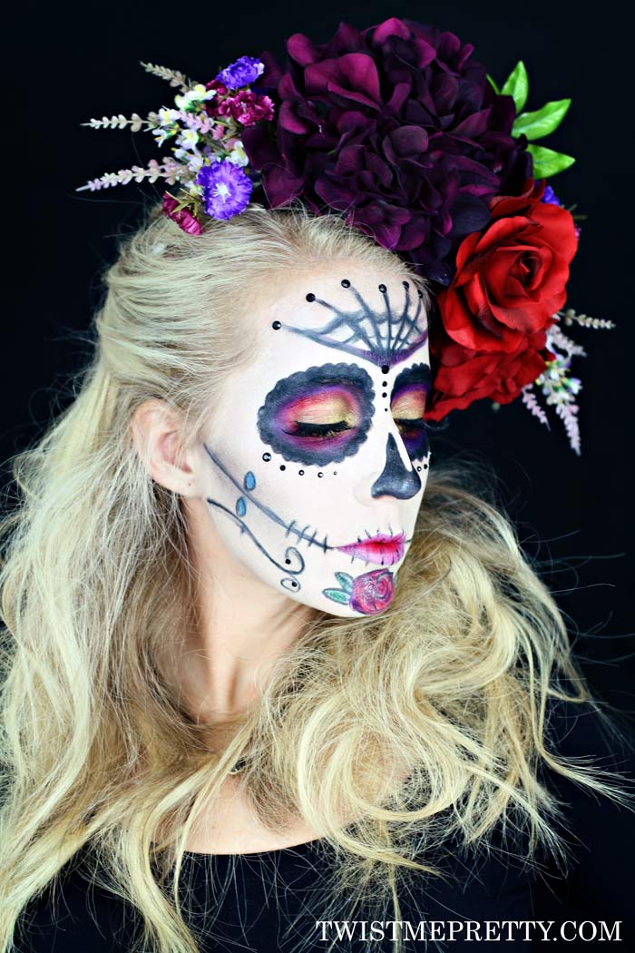 This look is one you will probably need to do a little more planning for since you will need to make or buy a floral headband (I have a tutorial for that) and you will need makeup with high pigment and a lot of colors.