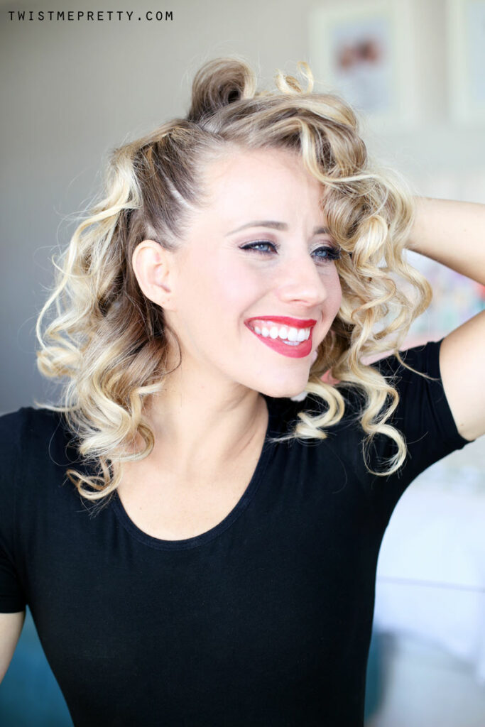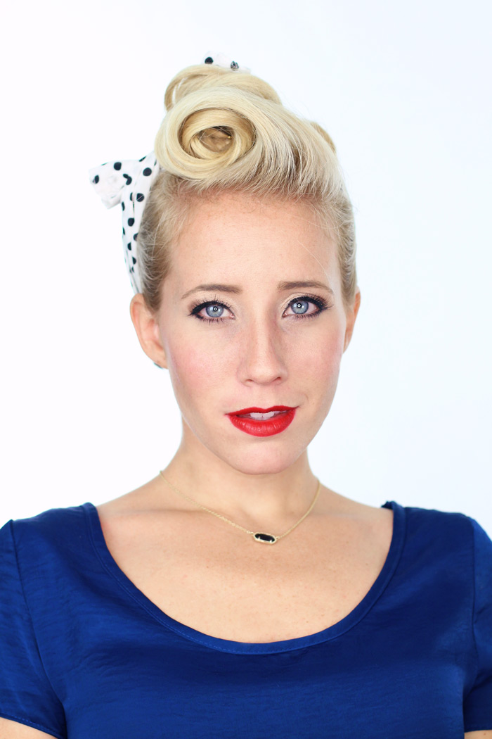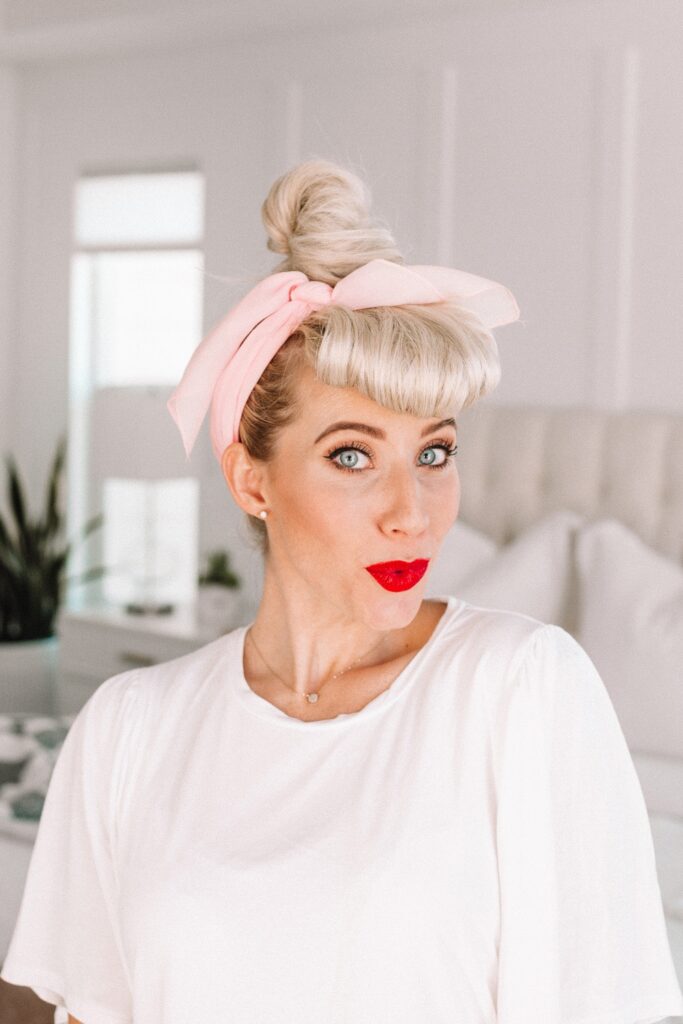 This hairstyle is one of my favorites — it’s SO fun!! It reminds me so much of I love Lucy and you can do it in a snap. I curled my bangs just to make the hair rolled under easier but that step is optional. You can use a little more product and get the same look without heat, I just didn’t want to use too much hairspray as I was styling several different hairstyles.