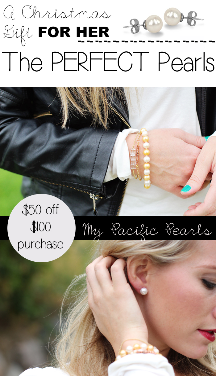 Your pearls will come with a certificate of authenticity, premium packaging including a gorgeous box and travel bag, and there’s risk free returns and fabulous customer service. I’ve really enjoyed working with My Pacific Pearls. Because Christmas is right around the corner, we’ve teamed up to offer you $50 off a purchase of $100 of more. So if you’ve always wanted some real pearls, make sure to tell your significant other about My Pacific Pearls! I swear, you won’t regret it!