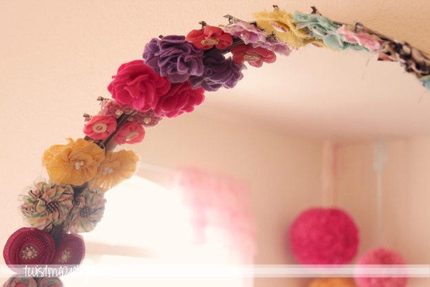 Cute! What a good idea to put the hair bows around the mirror, it adds more color too! Love the hearts!