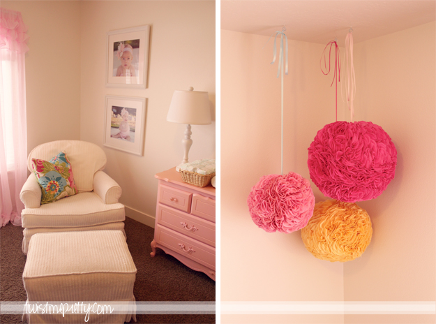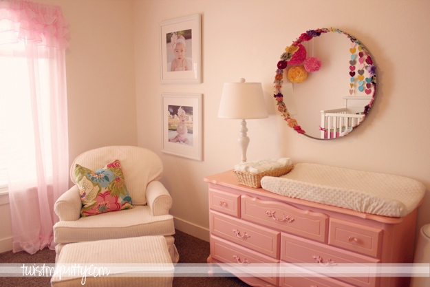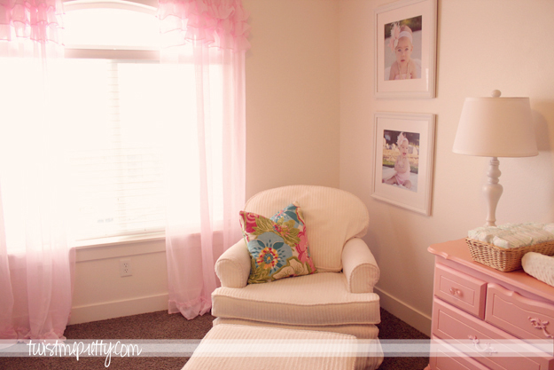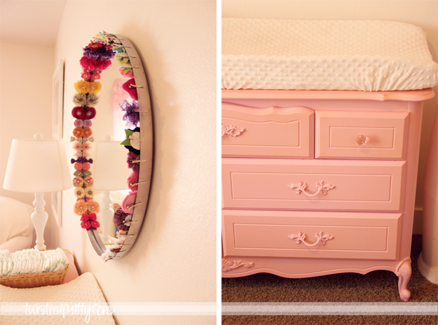 SOOOO adorable!!! Love the room, love the pink dresser with its pink handles, too;)