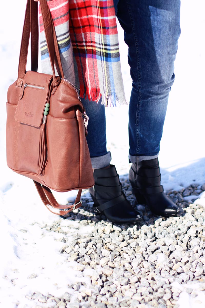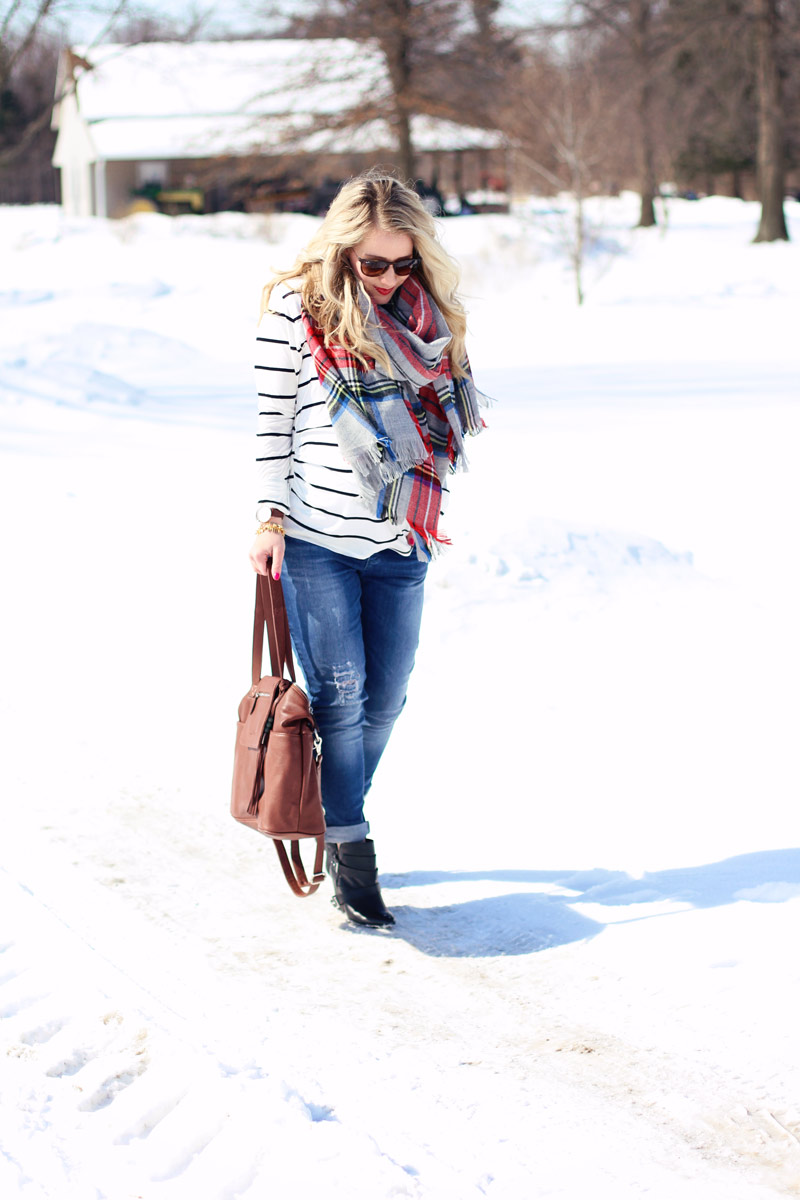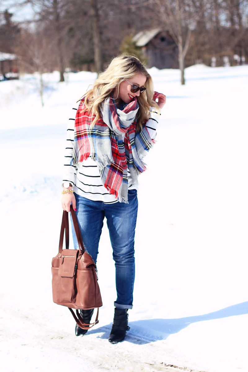 Top: Breton Stripe Maternity Tee, similar non maternity here | Scarf: Grey Tartan, out of stock. Similar here | Jeans: Maternity boyfriend jeans, similar non maternity here | Boots: c/o Lulu*s Black Wedge Booties | Bag: c/o Lily Jade Diaper Bag | Watch: c/o Daniel Wellington Classic Lady. | Bracelet: c/o Stella and Dot Renegade Cluster | Rings: c/o Stella and Dot | Hair Extensions: c/o Laced Hair | Sunglasses: c/o Sunglasses Shop, mine are the RayBan Erika