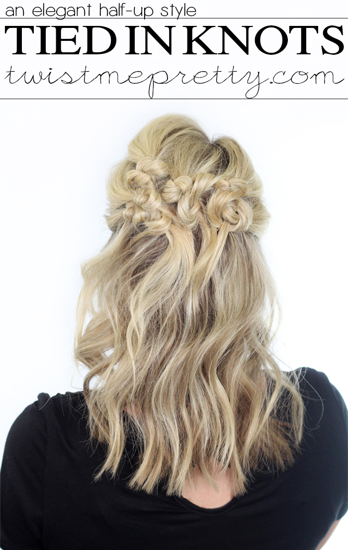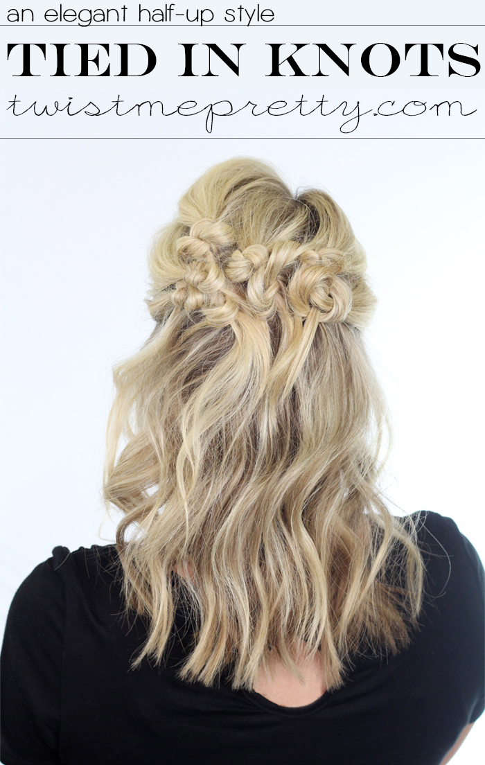 Today’s hairstyle was a happy accident. I initially just wanted to get my bangs out of my face and it morphed into this really pretty half-up style. What do you guys think? It’s a perfect second day hairstyle… let’s be honest, or sixth day hairstyle, and it keeps the hair out of the face. It’s fairly quick and you can easily wear it with left over curls or even throw the ends into a messy bun or keep knotting all the way down for a more formal look.