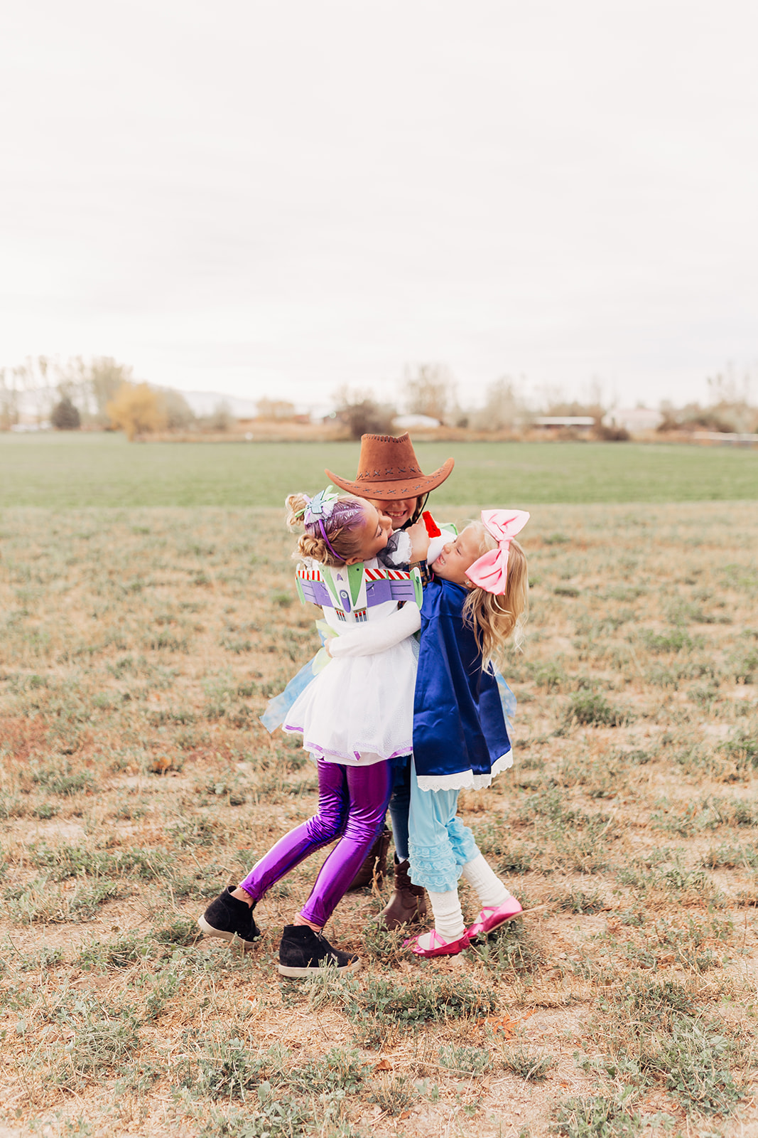 Last but not least, we had Woody and Buzz. All of my girls have become the best of friends since we started blending our families and I love seeing their relationship develop. Savvy was sooo excited about having purple glitter in her hair to represent Buzz’s purple helmet. And I love how Demi’s Woody costume turned out! It was the perfect mix of girly and cowboy.