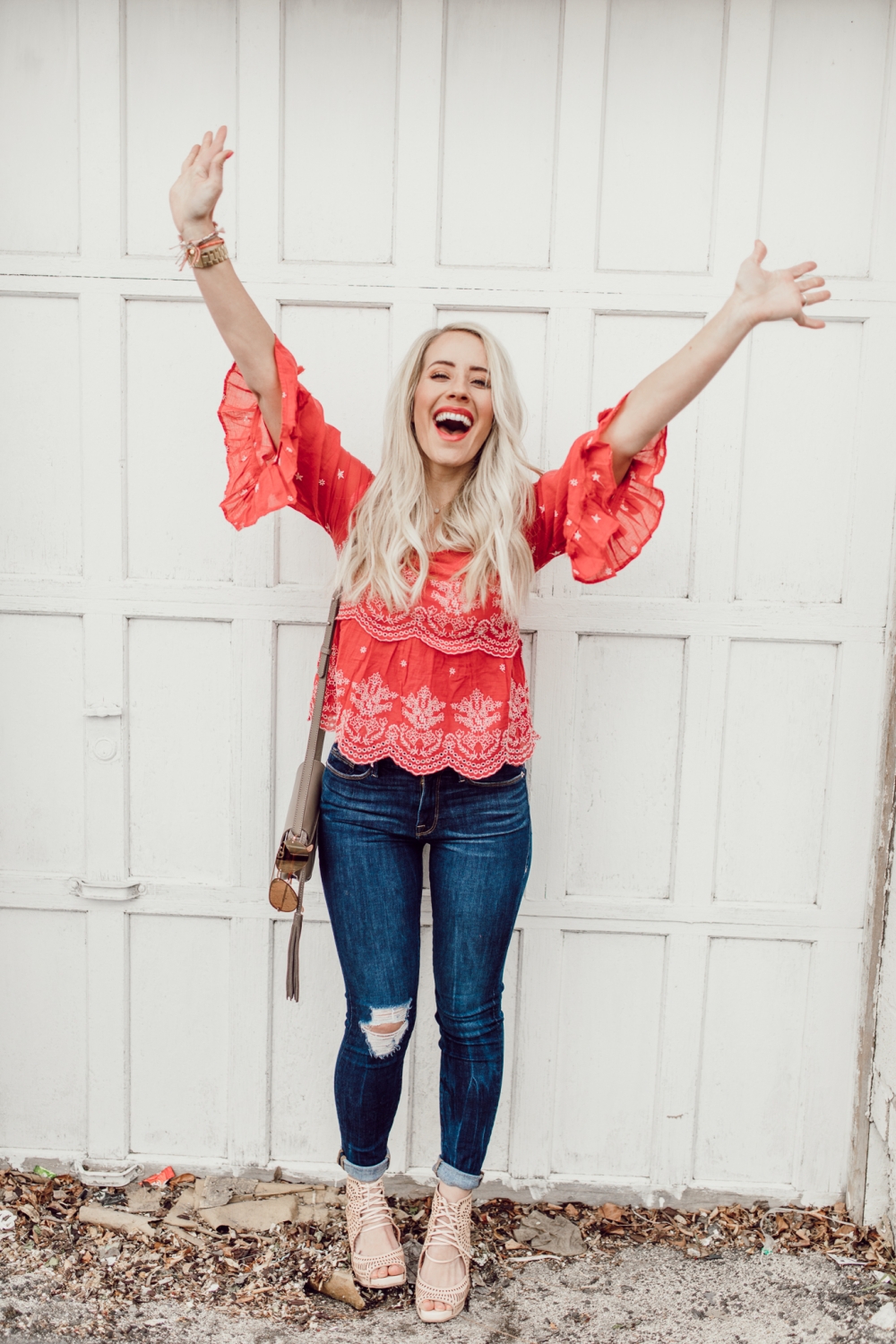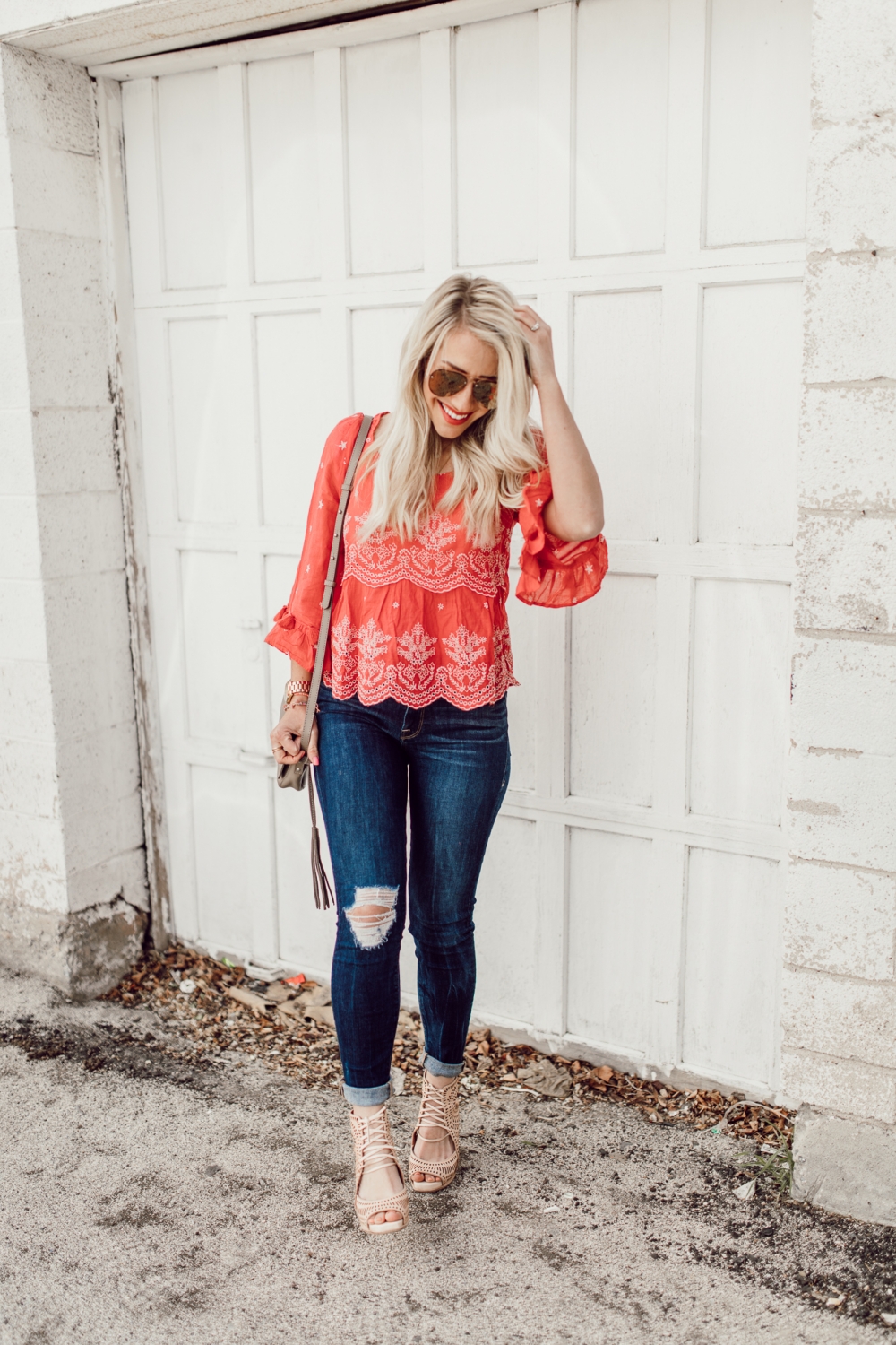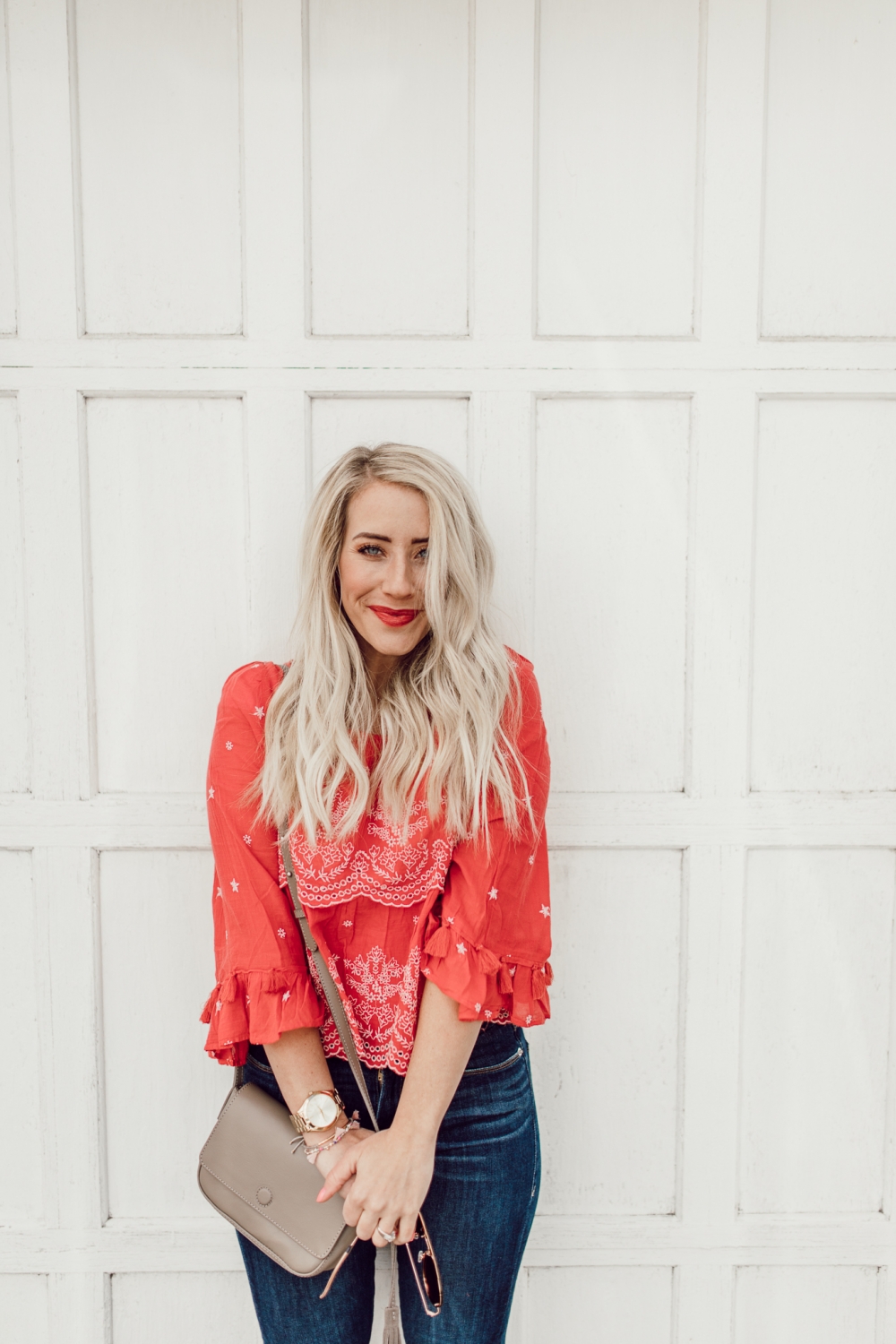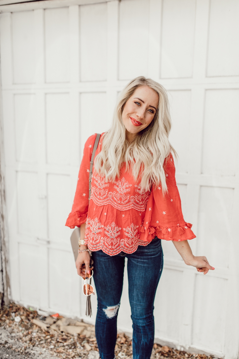 A couple months ago I starting looking through my closet and realized that I’ve got a LOT of neutrals. So many white shirts and chambray basics! I honestly don’t have many pops of color!! On my shopping trip that I talked about here one of my goals was to buy a couple bright pieces that I would normally shy away from. I saw this blouse at AE and it was like the heavens opened up and angels started singing!!!