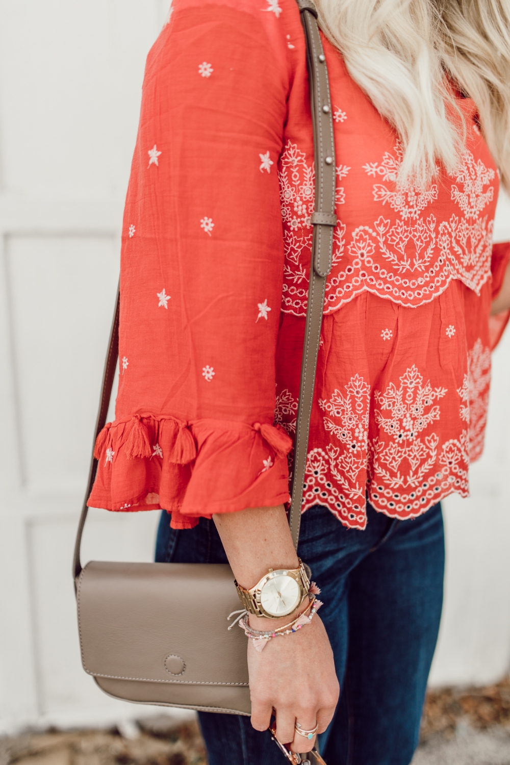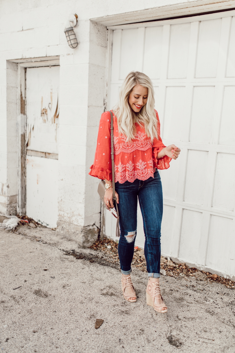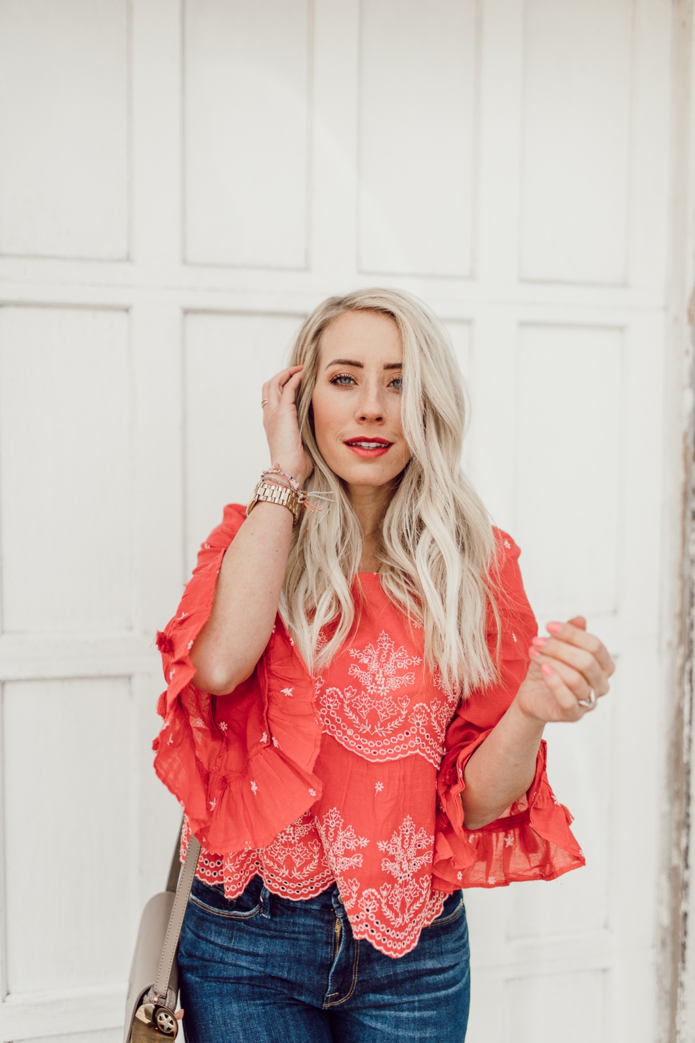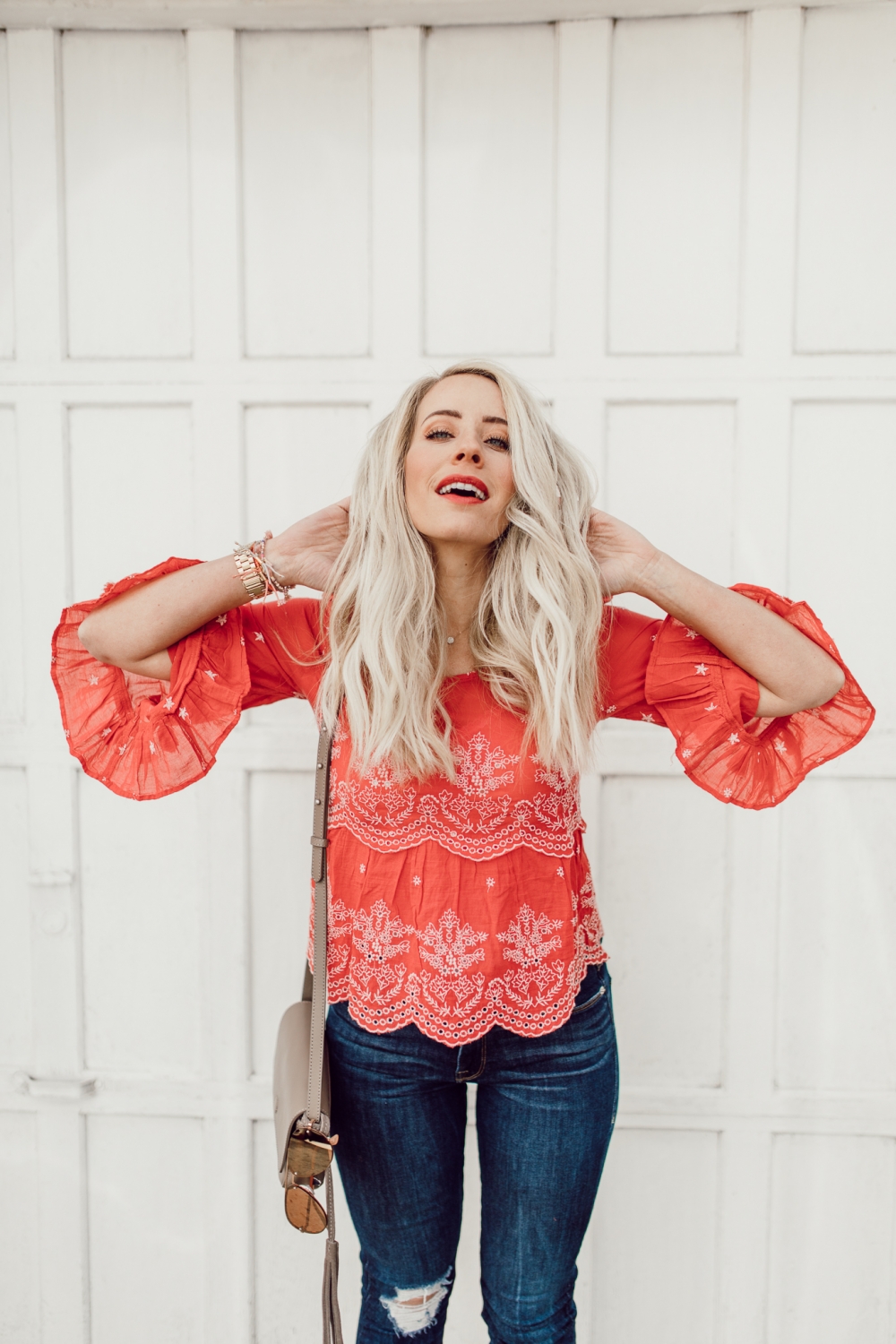 A couple months ago I starting looking through my closet and realized that I’ve got a LOT of neutrals. So many white shirts and chambray basics! I honestly don’t have many pops of color!! On my shopping trip that I talked about here one of my goals was to buy a couple bright pieces that I would normally shy away from. I saw this blouse at AE and it was like the heavens opened up and angels started singing!!!