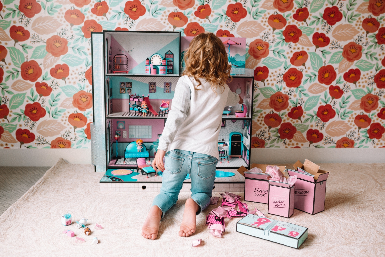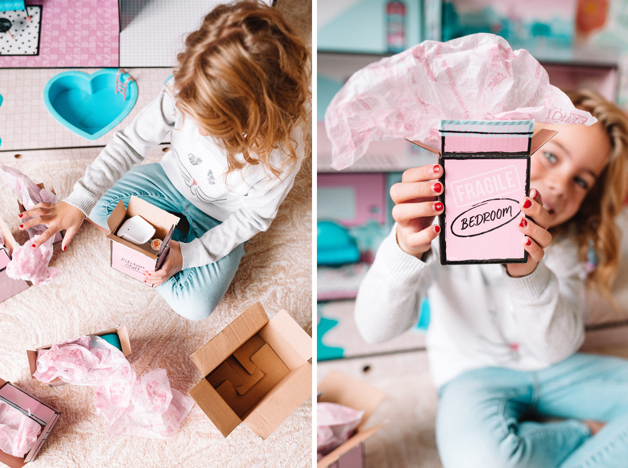 It’s THE cutest little house with 85+ surprises and it took maybe an hour to put together. The furniture and accessories are delivered in an adorable delivery truck that my twin boys quickly confiscated…sorry Sav but good luck getting that one back! Each room has its own box that you can open and unwrap and Savy had so much fun setting everything up and decorating her new house.
