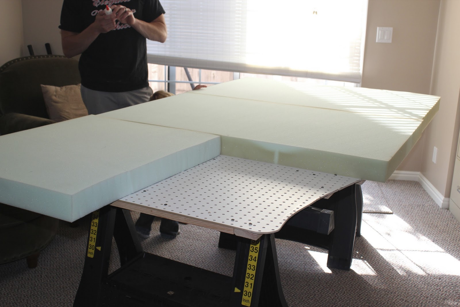 - 3-inch foam- We got ours in the camping section at Home Depot. They were having a crazy good deal. We bought 2 twin sized mattress pads for $19.99. Foam is EXPENSIVE. Before we found the mattress pads I was going to buy 2-inch foam for $12.00 a yard at a fabric store. That was with a 40% off coupon too. RIDICULOUS. So before you start this project make sure you can afford the foam in your budget!