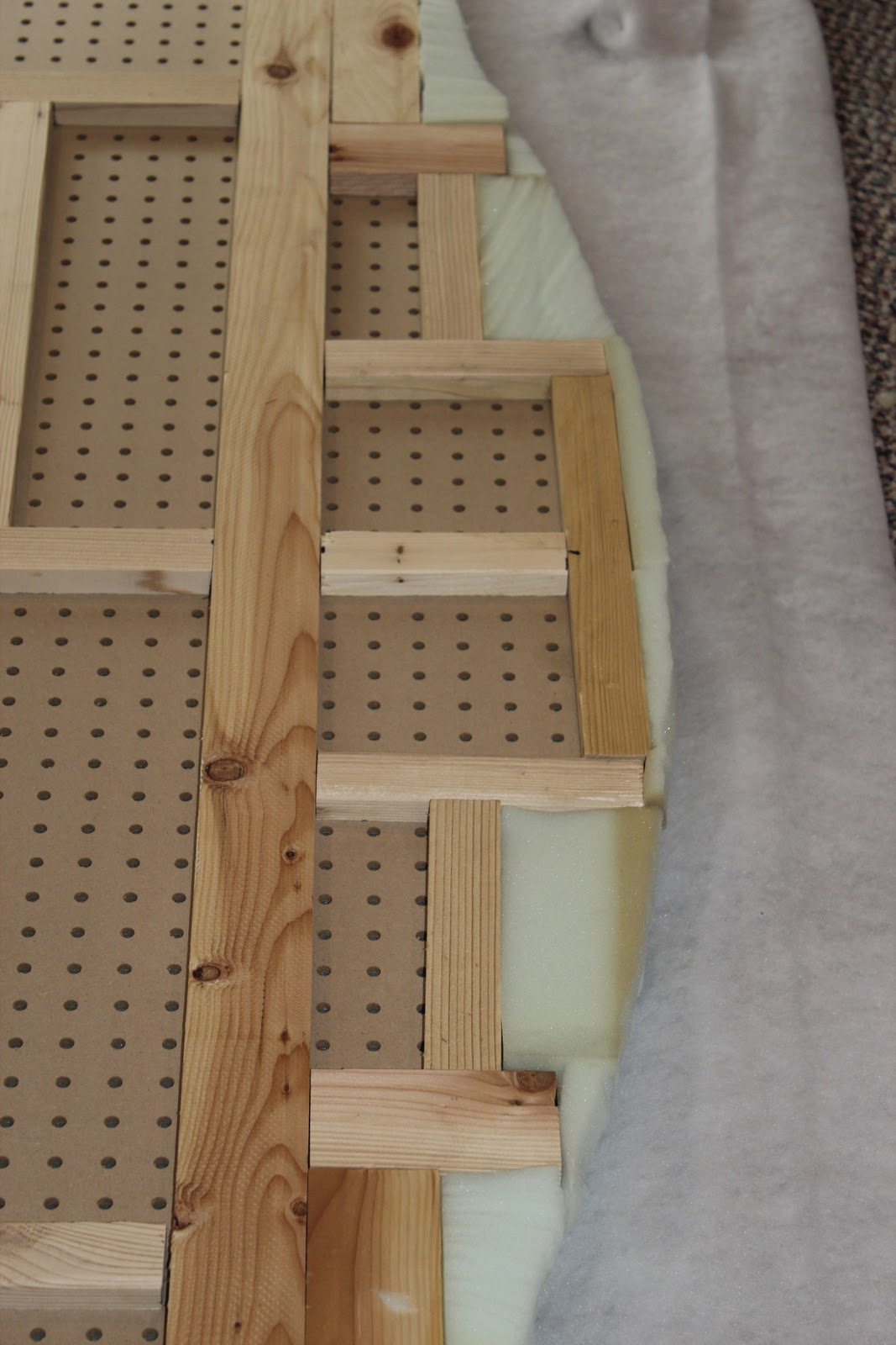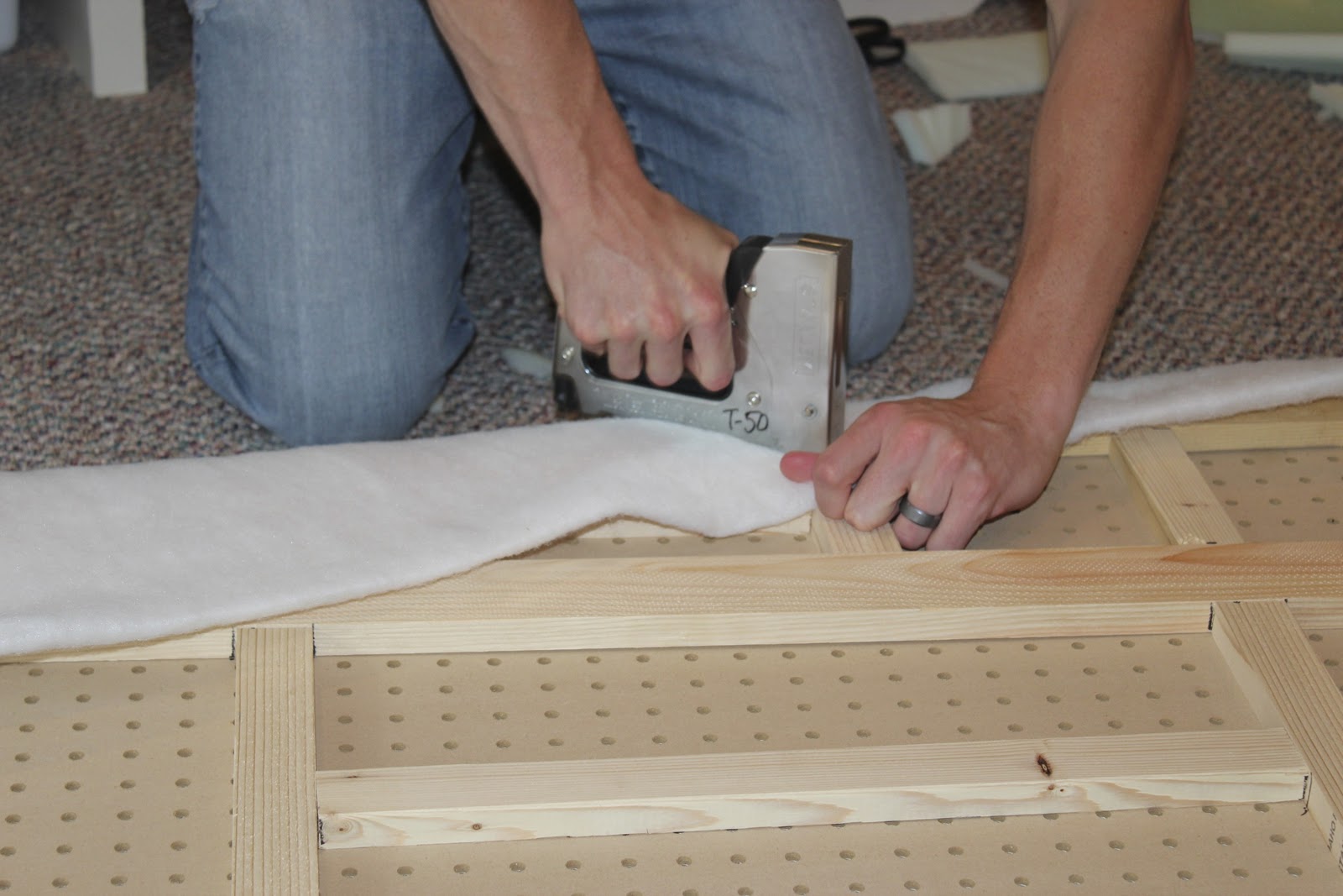 Now use that saw and cut out your 1 x 2 x 8’s and your 1 x 3 x 8’s to fit the back of the board. The peg board just isn’t strong enough. If you want to start out with a strong board, by all means. I was going to tuft a headboard, decided it would be too pricey with all the fabric you needed. So I know nothing about using a different board! Sorry folks.