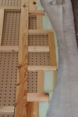 This is what ours looked like. Our mistake was that top part. If we had to do it again we would take the 1 x 3 x 8’s all the way up to the top of the headboard and then shave them down with the jigsaw. The way we did it just made upholstering the headboard really hard.