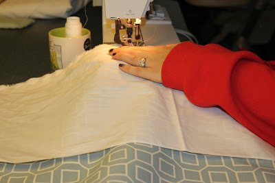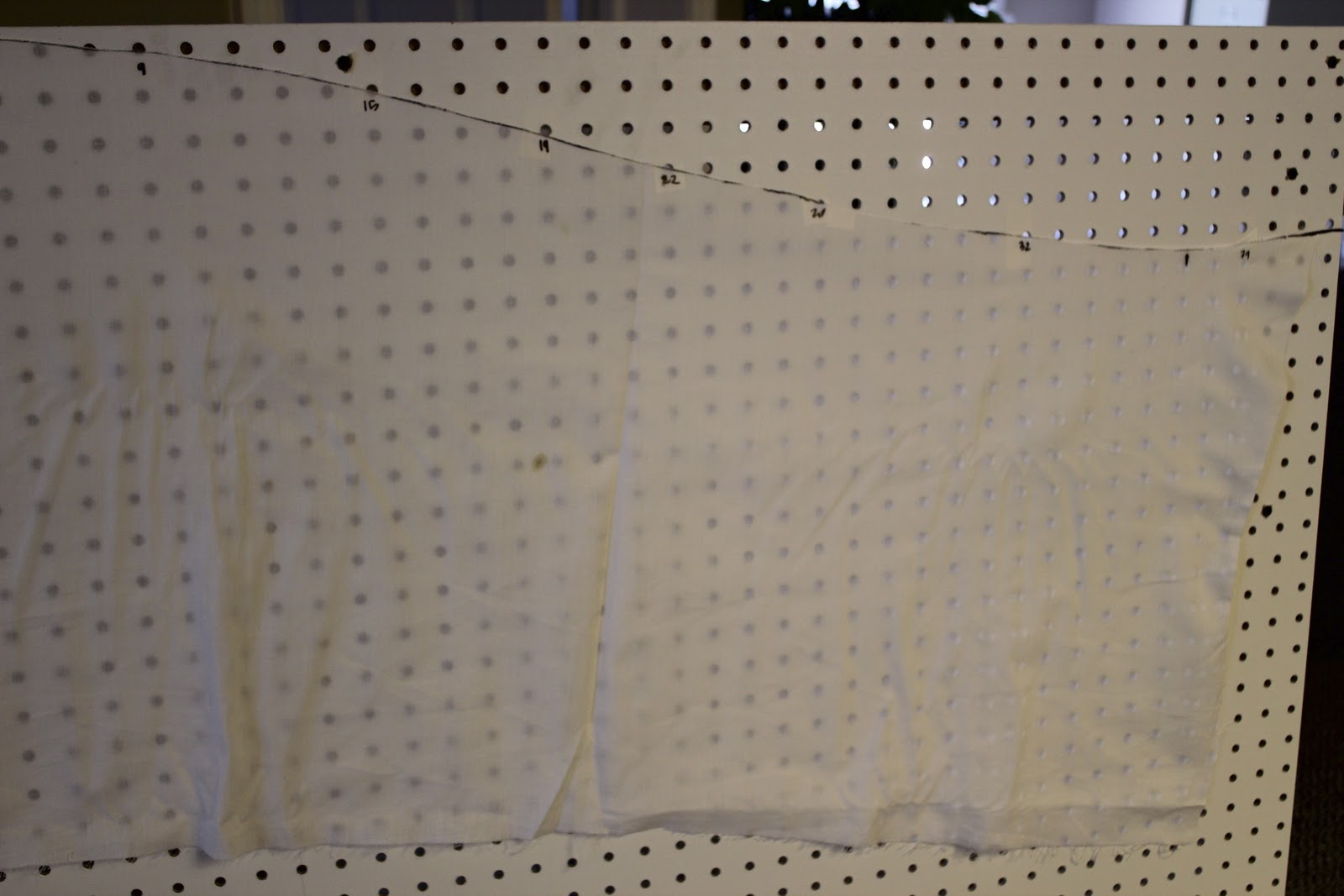 Next I sewed more of that white fabric onto the ends of my fabric. I was worried that my 54″ wide fabric wouldn’t be wide enough to wrap around the top and bottom of the board.