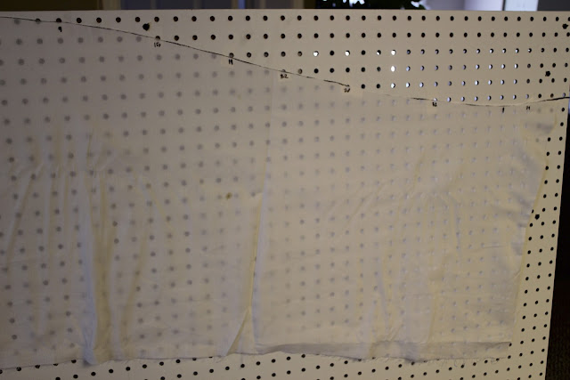 Take some scrap fabric and figure out the shape of headboard you want. I folded white fabric in half and kept drawing lines until it was what I wanted.