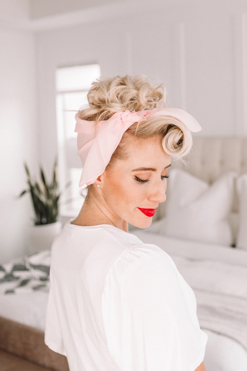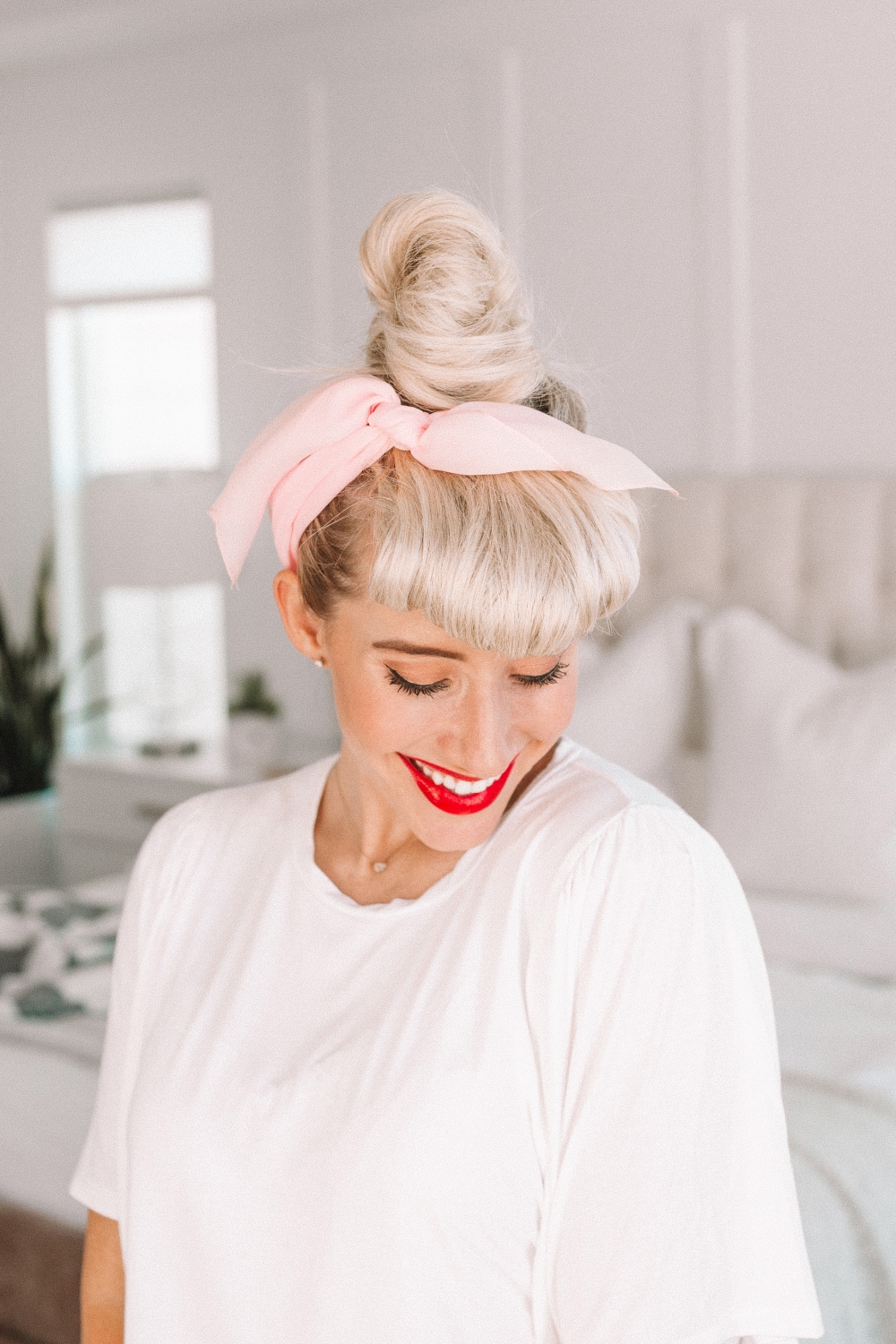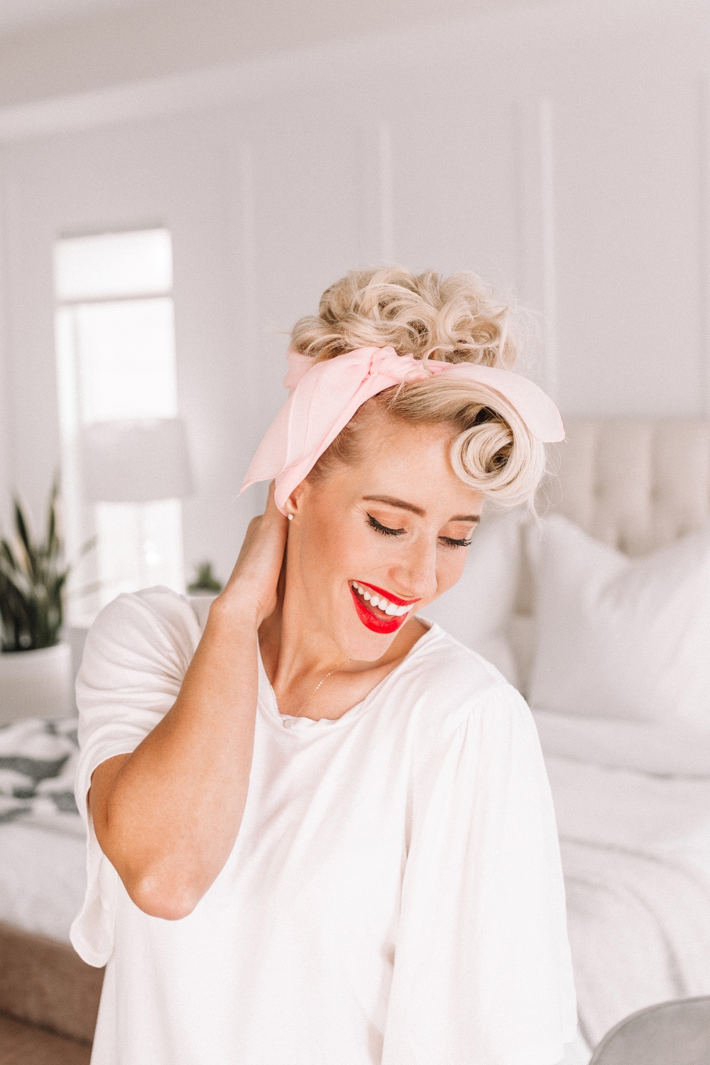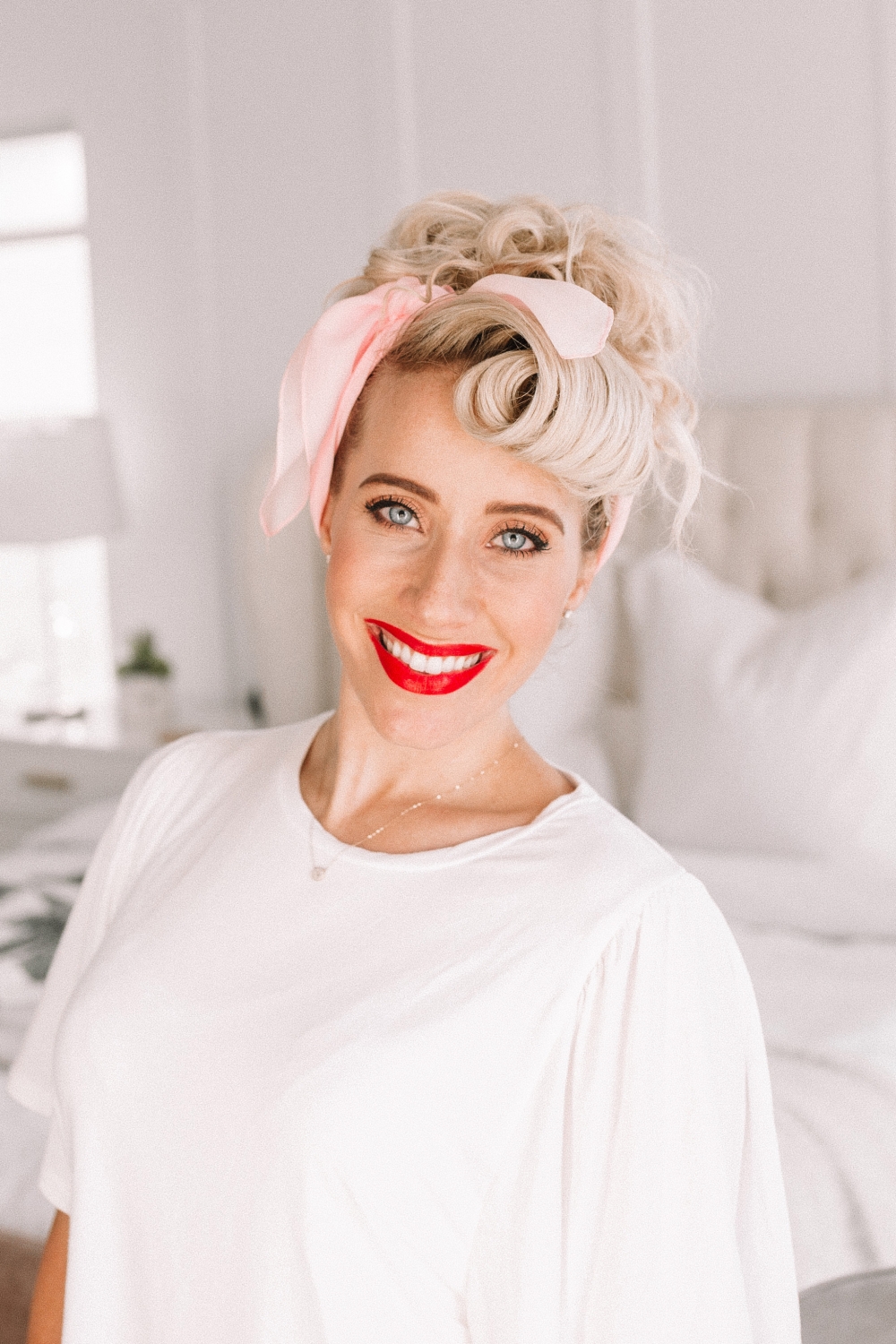 This hairstyle is one of my favorites — it’s SO fun!! It reminds me so much of I love Lucy and you can do it in a snap. I curled my bangs just to make the hair rolled under easier but that step is optional. You can use a little more product and get the same look without heat, I just didn’t want to use too much hairspray as I was styling several different hairstyles.