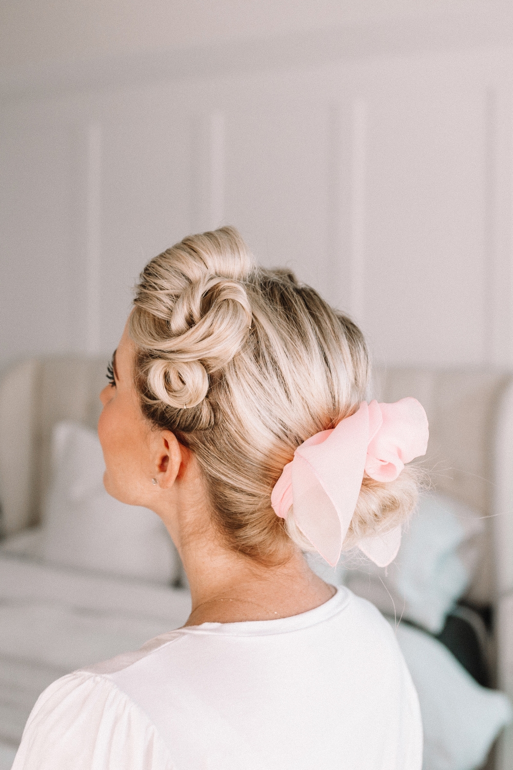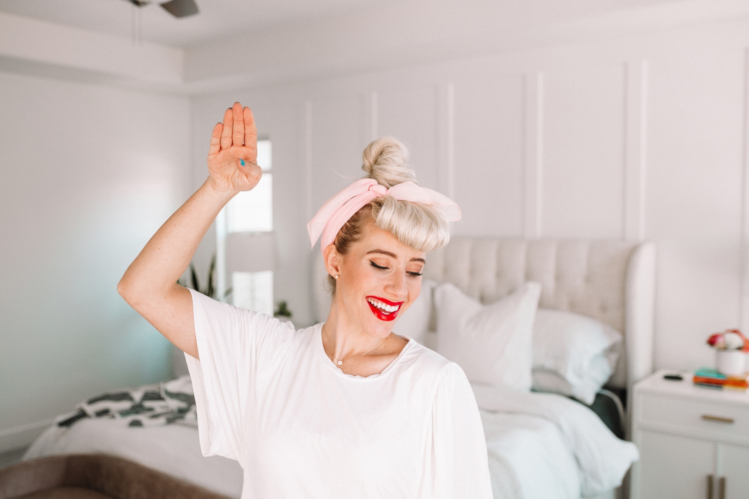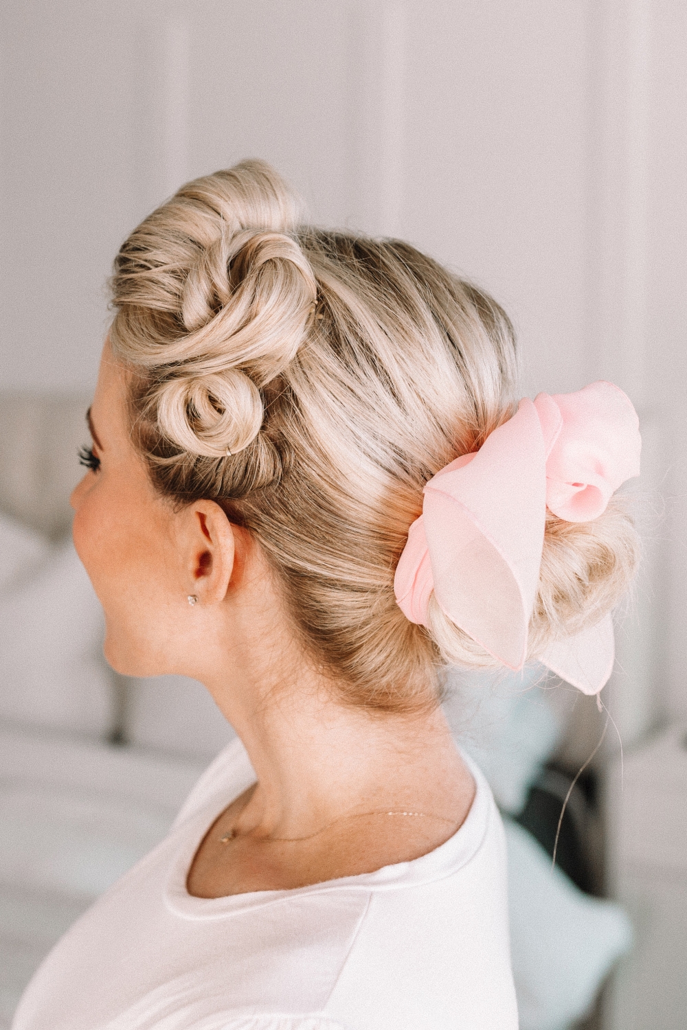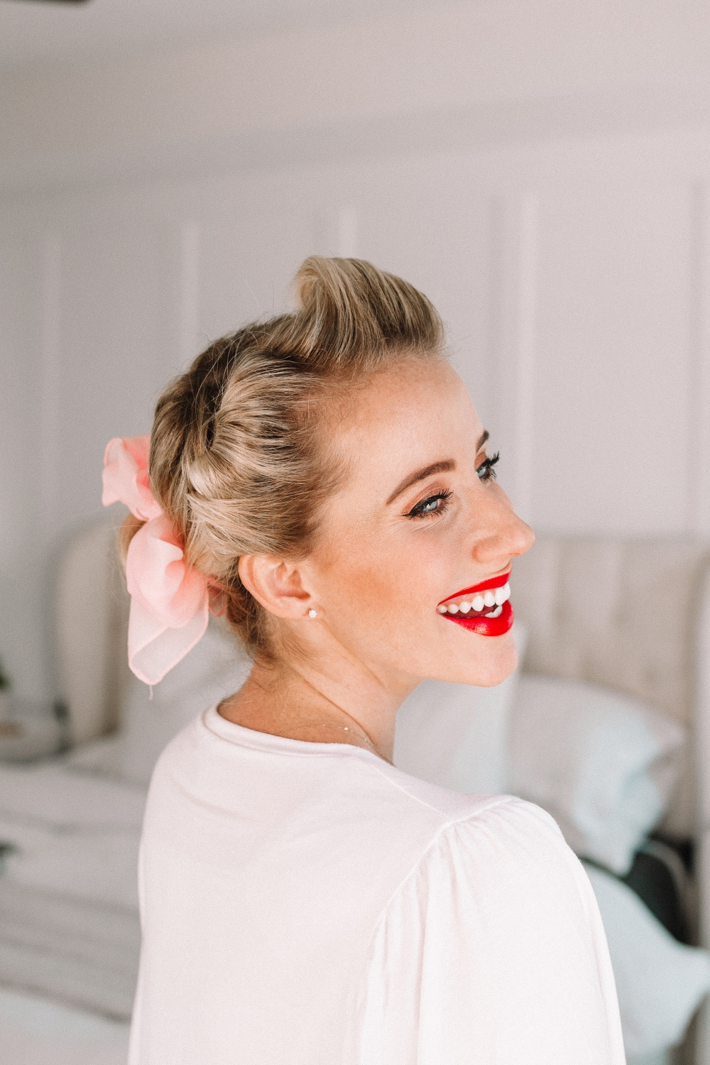This hairstyle is one of my favorites — it’s SO fun!! It reminds me so much of I love Lucy and you can do it in a snap. I curled my bangs just to make the hair rolled under easier but that step is optional. You can use a little more product and get the same look without heat, I just didn’t want to use too much hairspray as I was styling several different hairstyles.