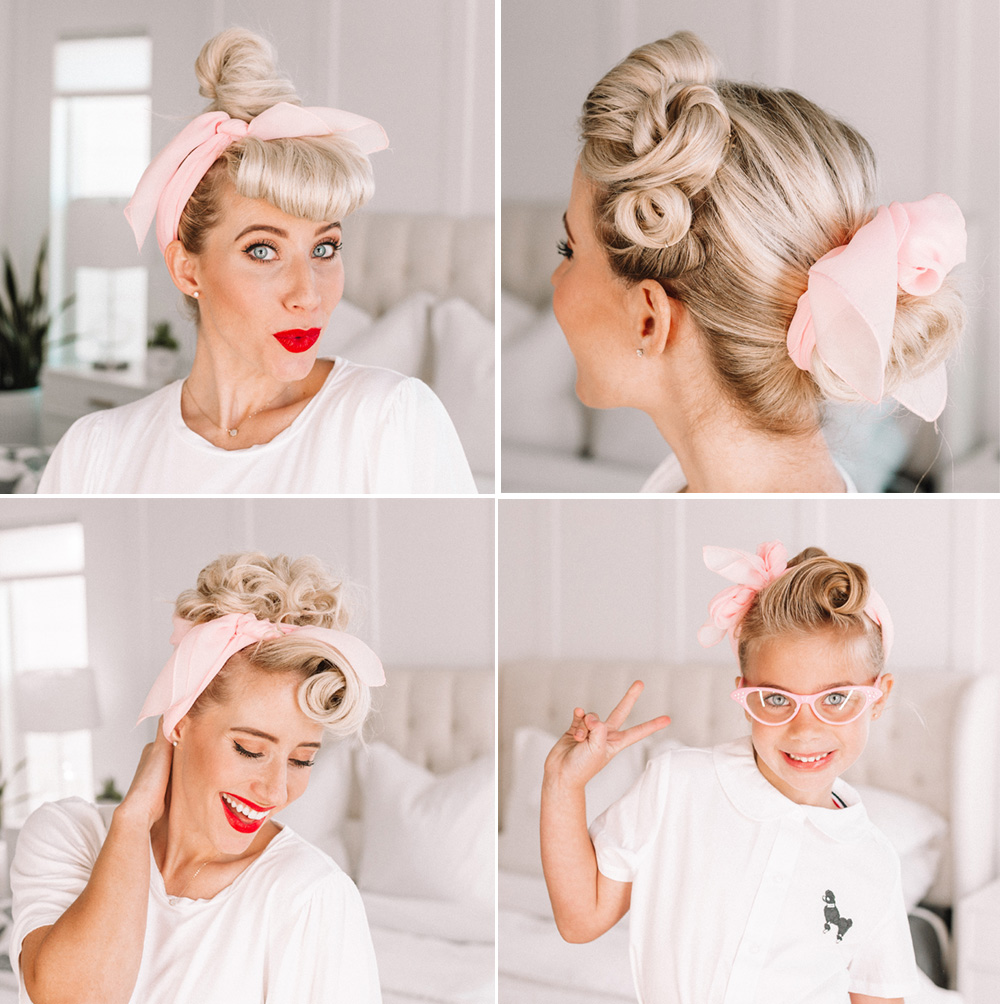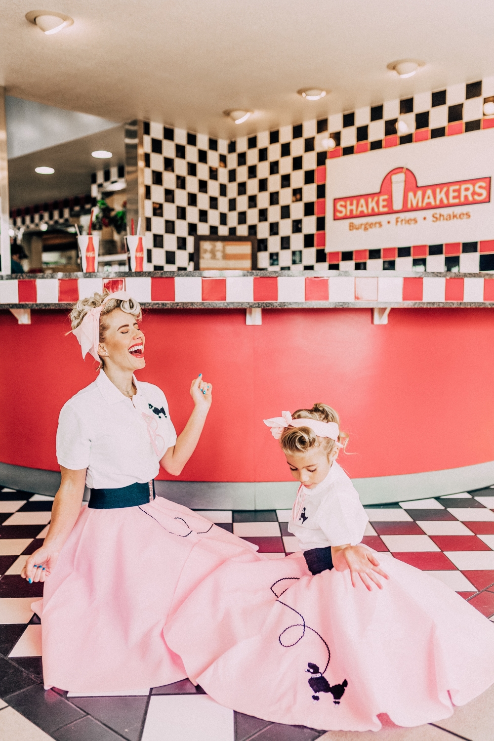 Happy Halloween!!! If you’re here to learn some quick and easy 50’s hairstyles, you’re in the right place. My daughter and I love dressing up for Halloween and this year I just couldn’t stop thinking about poodle skirts. So we dressed up, ordered some milkshakes and fries and boogied our little hearts out!