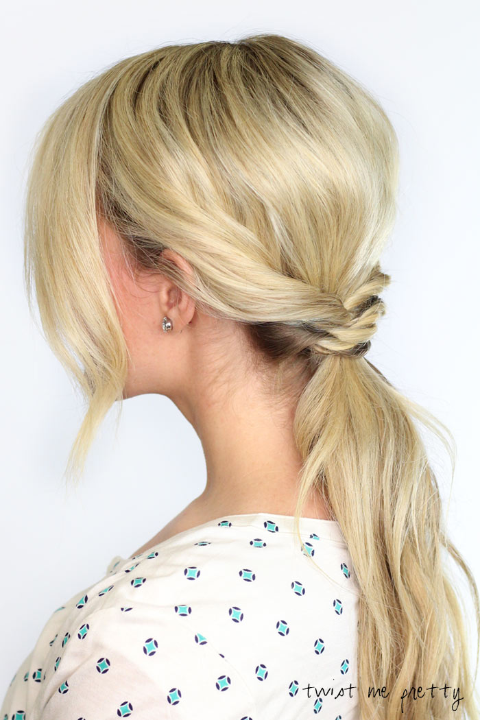 6) Gather another small section from the front on the left side, directly underneath the first twist, and twist away from the face. Wrap over the ponytail base and secure by adding to the already existing ponytail holder