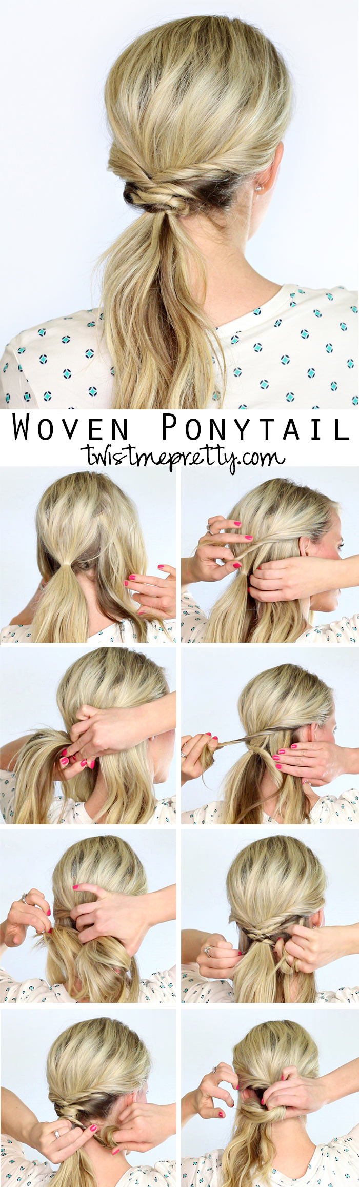 Onto the hairstyle — uhh… first off, I LOVE IT! I’ve seen tutorials similar to this that use bobby pins to secure the hair and for a busy mom who doesn’t have time to re-adjust or fix bobby pins that slide this method does the trick. You’ll need a few clear elastics and three minutes max to pull this beautiful weaved ponytail together. I hope you enjoy the tutorial and make sure you’ve subscribed to my YouTube channel because starting next week I’ll be sharing Halloween Makeup/Hair tutorials!