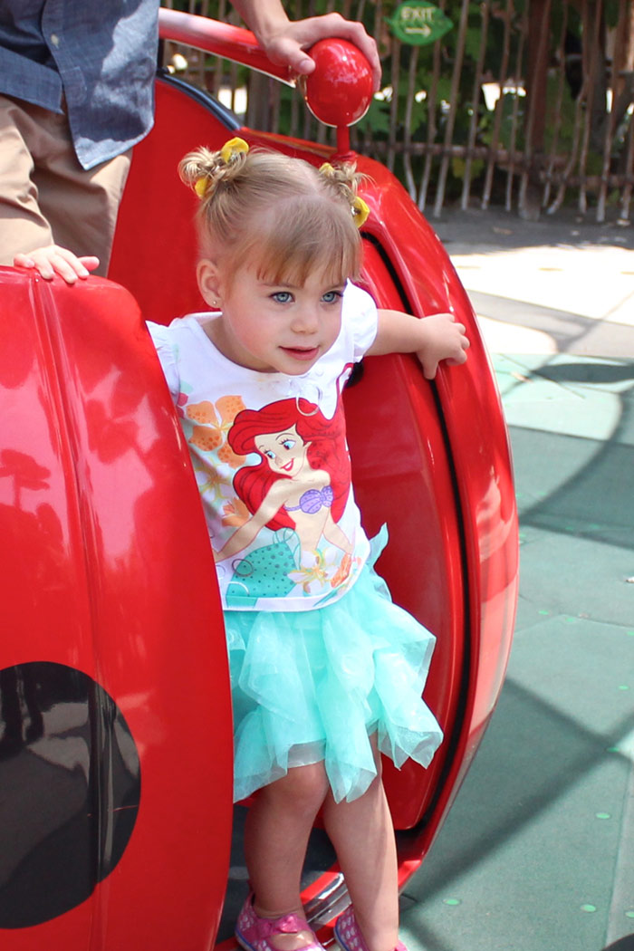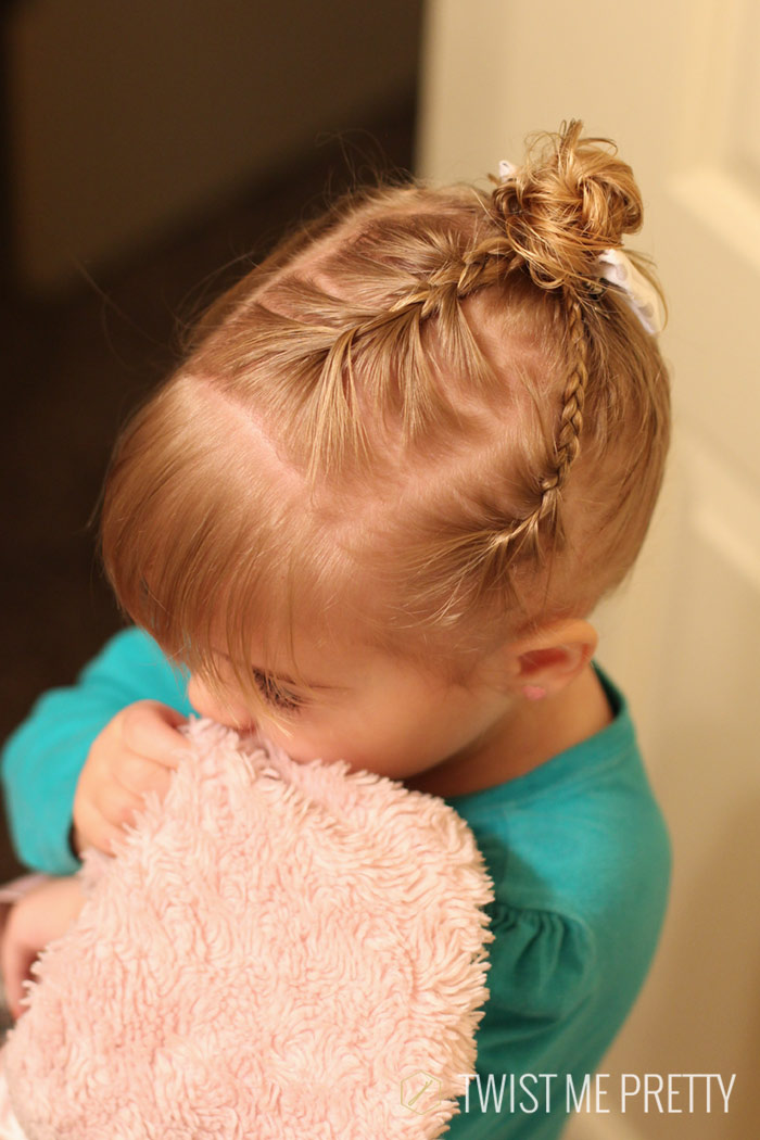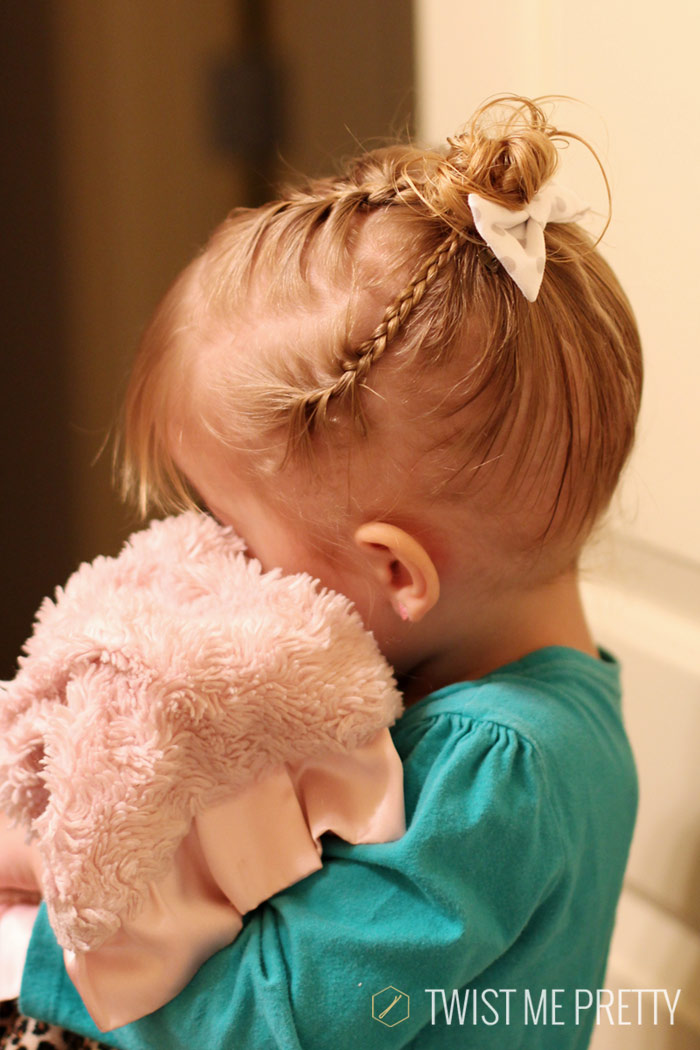 Isn’t she such a little sass? This is one of those styles that works great when heading to the pool or when you know they’re going to be rough all day. The succession of elastics keeps the hair tight and those wispy fly-a-ways down.