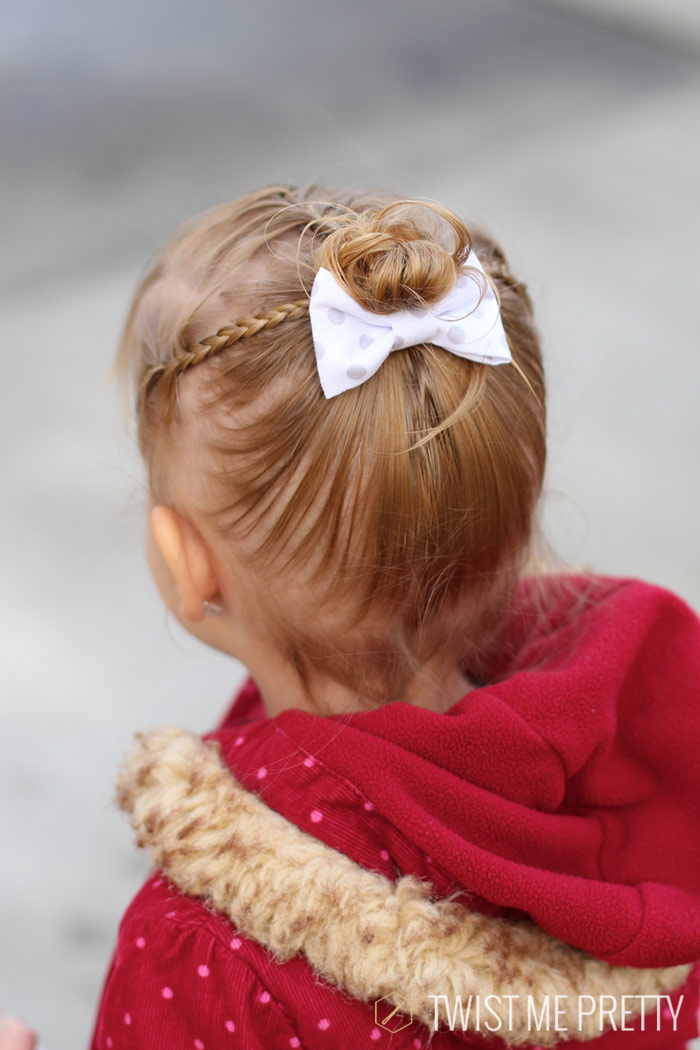 For this style you’ll want to start out by dampening the hair and getting some gel on your finger tips. French braid the bang area back until it hits the upper ear like in the picture and then secure the braid with a clear elastic. Go ahead and throw the ends into a messy bun. Then start on the other side and wrap a french braid around the head until you have no more hair to add in. I can almost make it to the other side but her hair is pretty thin and fairly short. So when I run out of hair I just do a three strand braid and throw the ends into the first messy bun and then hide any flaws with a bow. I absolutely love this hairstyle. She gets so many compliments when her hair is like this. If I use gel and spray it well it lasts all day but she does have hairs that come out near the nape of her neck after naptime. When her bangs are short they usually fall out too so I will secure that first triangle section up front with a clear elastic and then start the french braid.