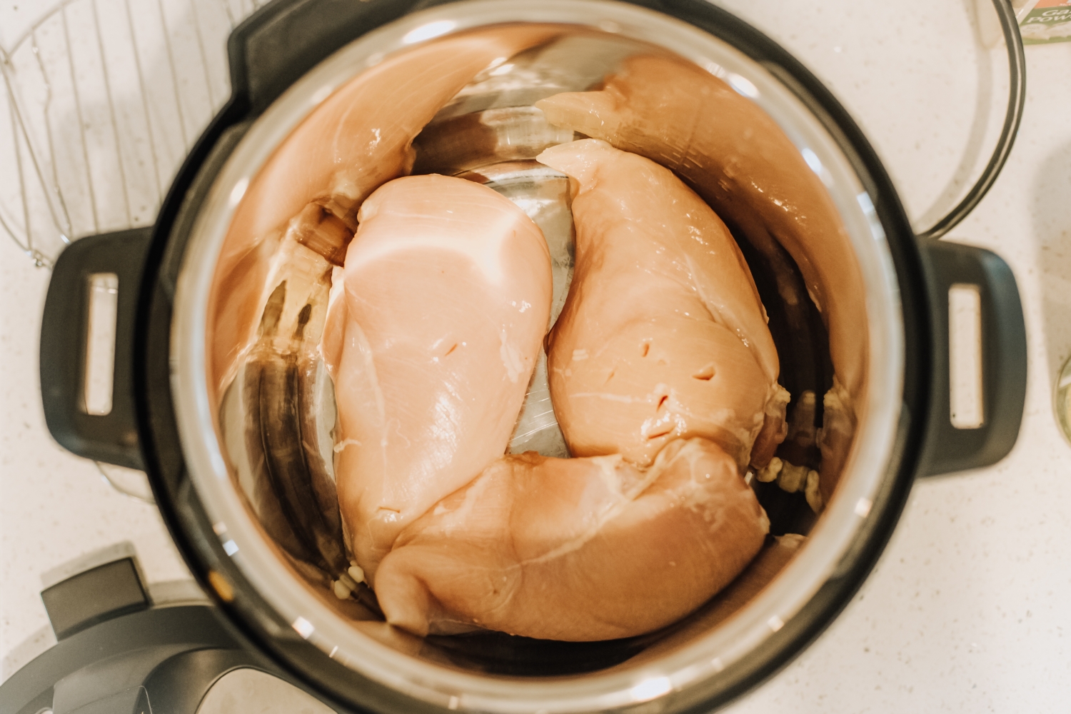 You’re gonna close the lid, and press the poultry option and set to 15 minutes. Shred the chicken with a fork, and serve with your desired toppings.