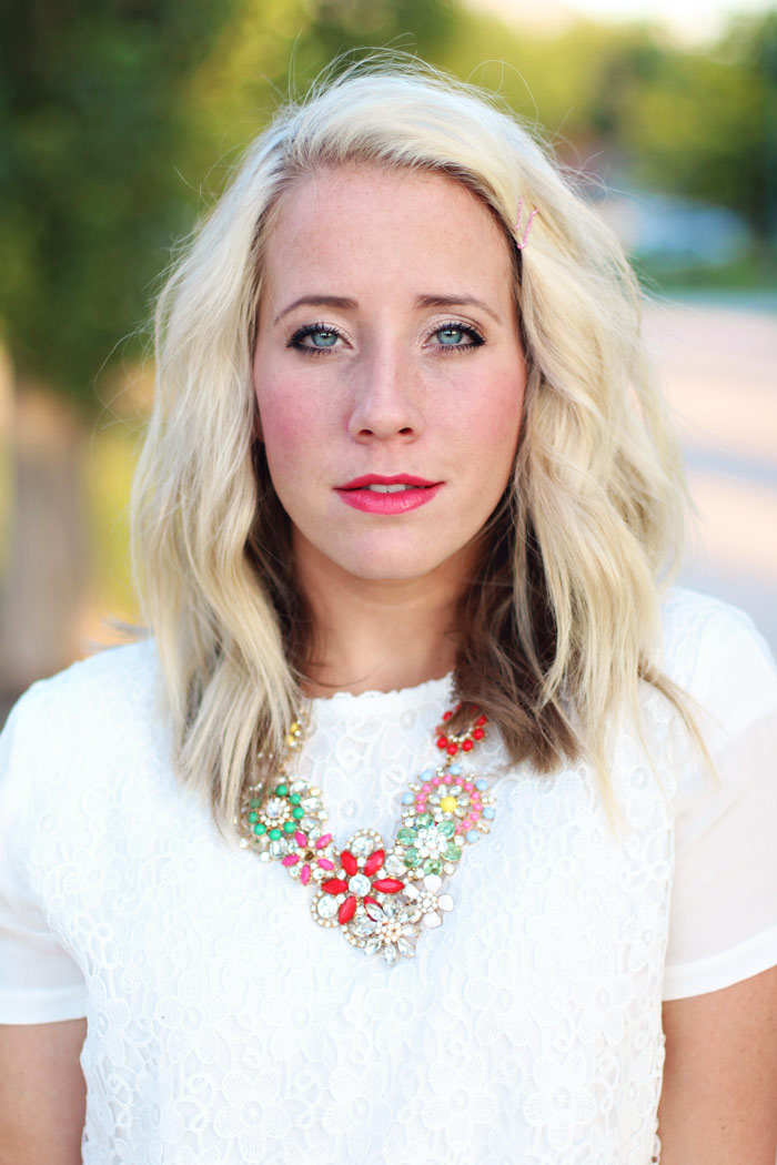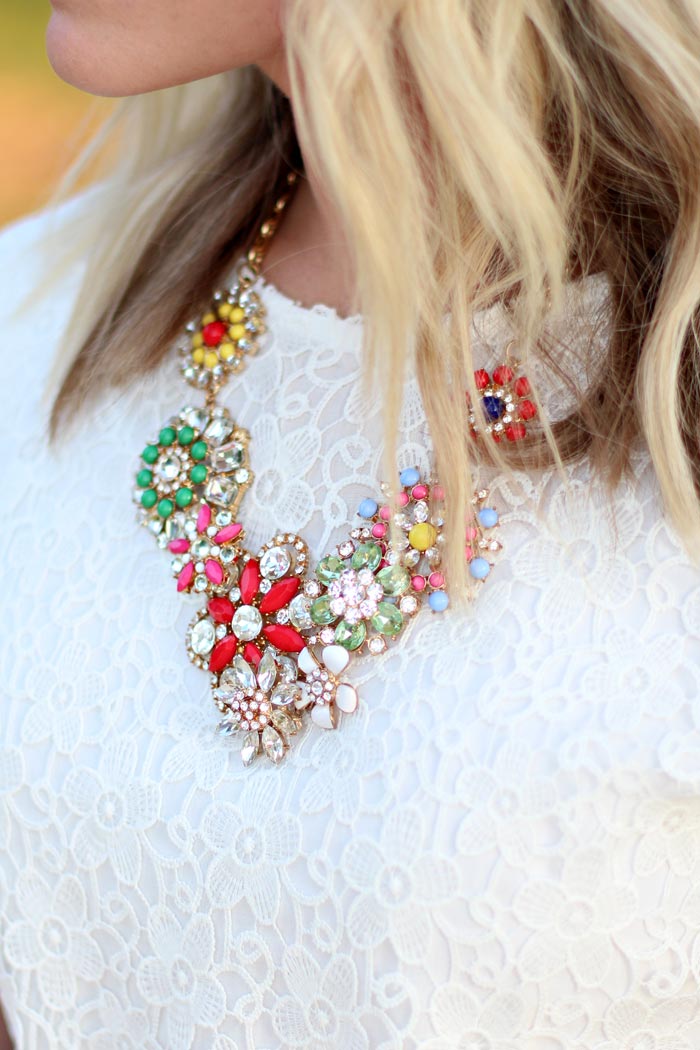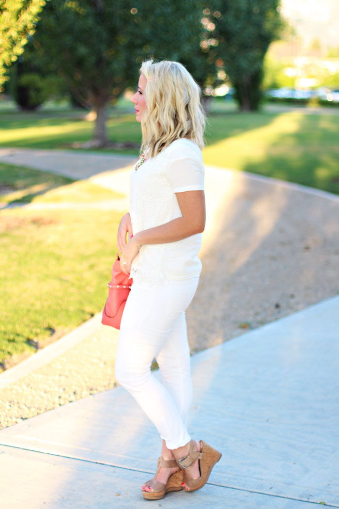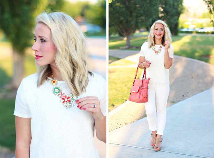 White on white is such a crisp, clean look! The lace top with those amazing Rag & Bone jeans looks amazing on you. I also love that you’ve added a brightly colored statement necklace to finish the look!
