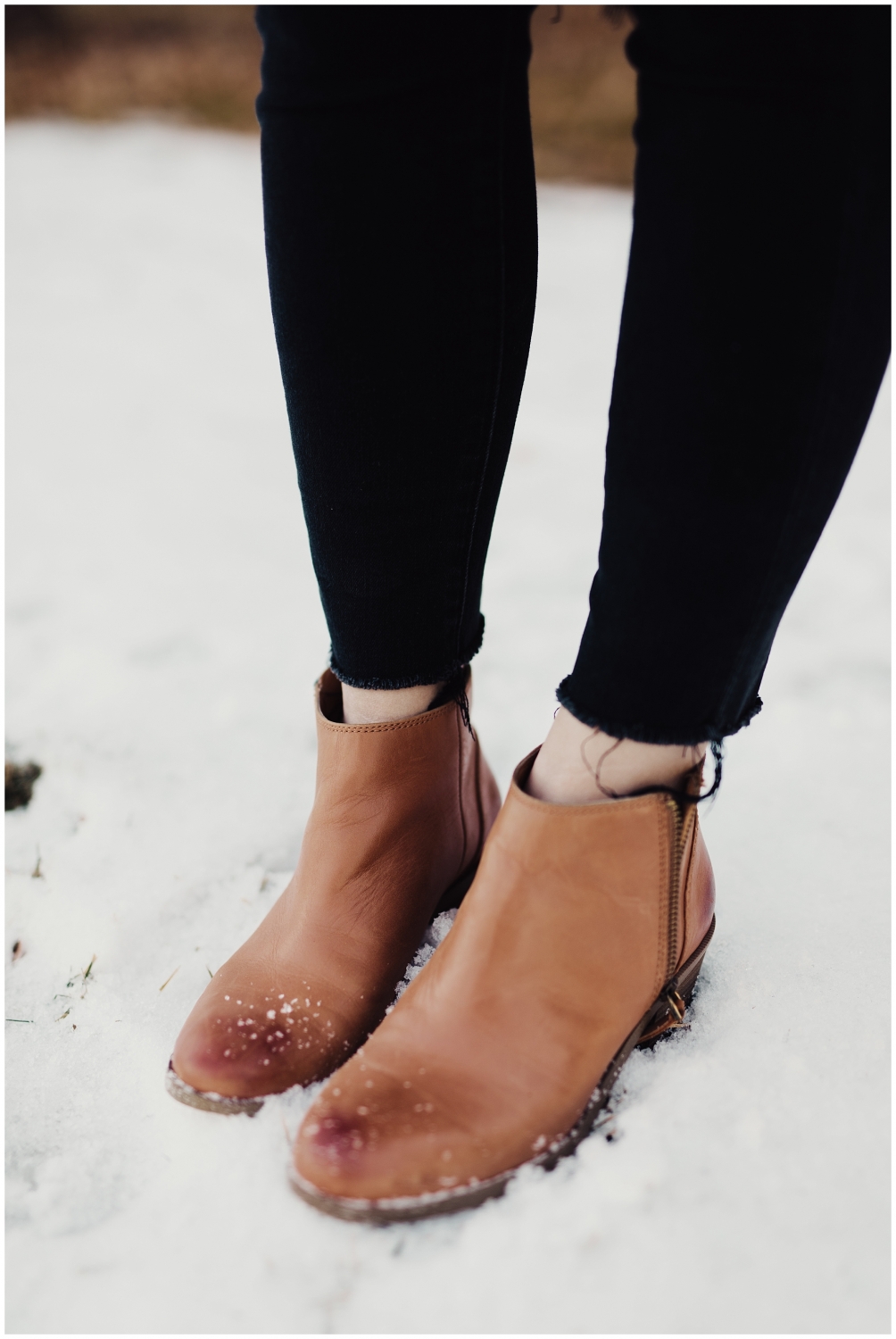 Then everyone needs a pair of high waisted black jeans. I have worn these nearly every day since I got them, they’re super cute and comfy. And then booties are obviously a must. I like to go with a caramel leather color + a grey suede pair. I have a black pair but I don’t wear them as often because like I said, I’m always wearing black pants! You can wear black booties with black pants, but it doesn’t look as cute!