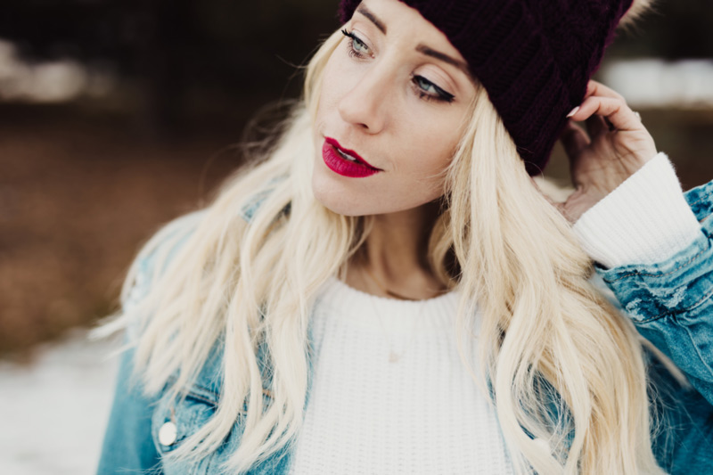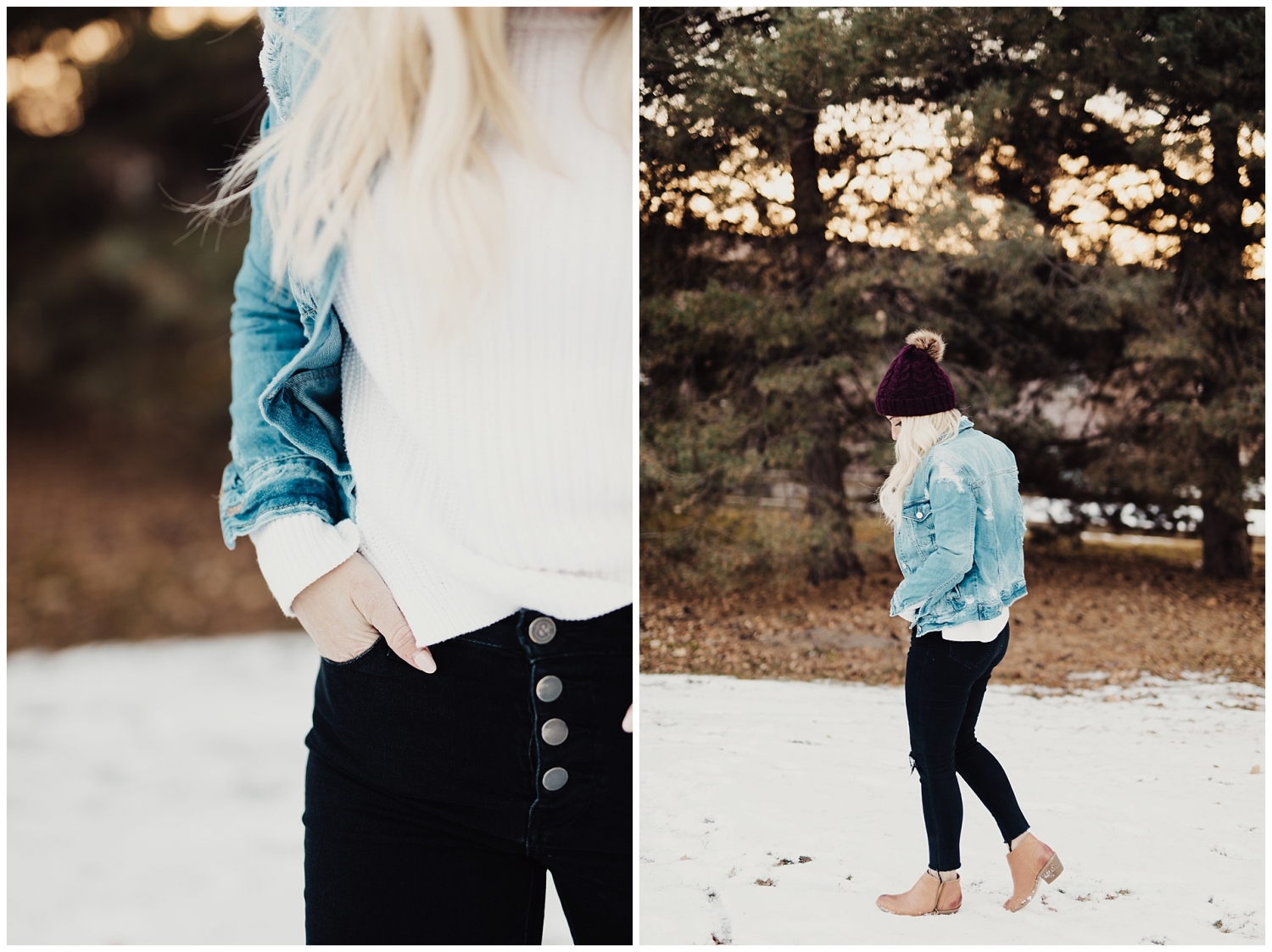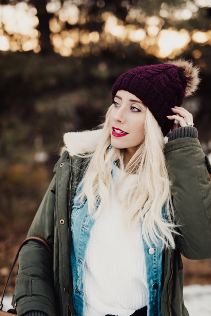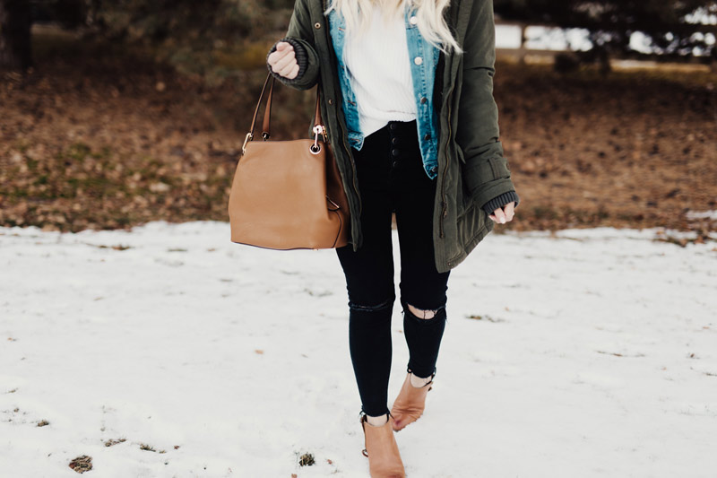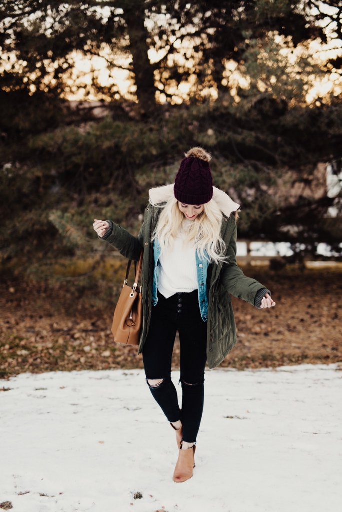 Second, I love layering a jean jacket underneath my coat. I usually just leave it inside my coat when I come in for the day! It adds a pretty pop of color while keeping you warm and then, if you get too hot with the coat on, you can take off your big winter coat and still have a light jacket to wear.