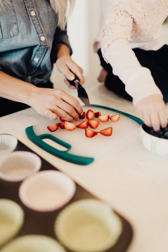 First you’re going to line your muffin tin with cupcake liners, and then start washing and cutting your fruit.