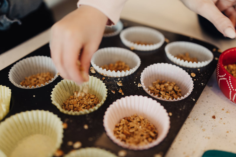 Then you’re going to put a little bit of granola on the bottom of the cupcake liners!
