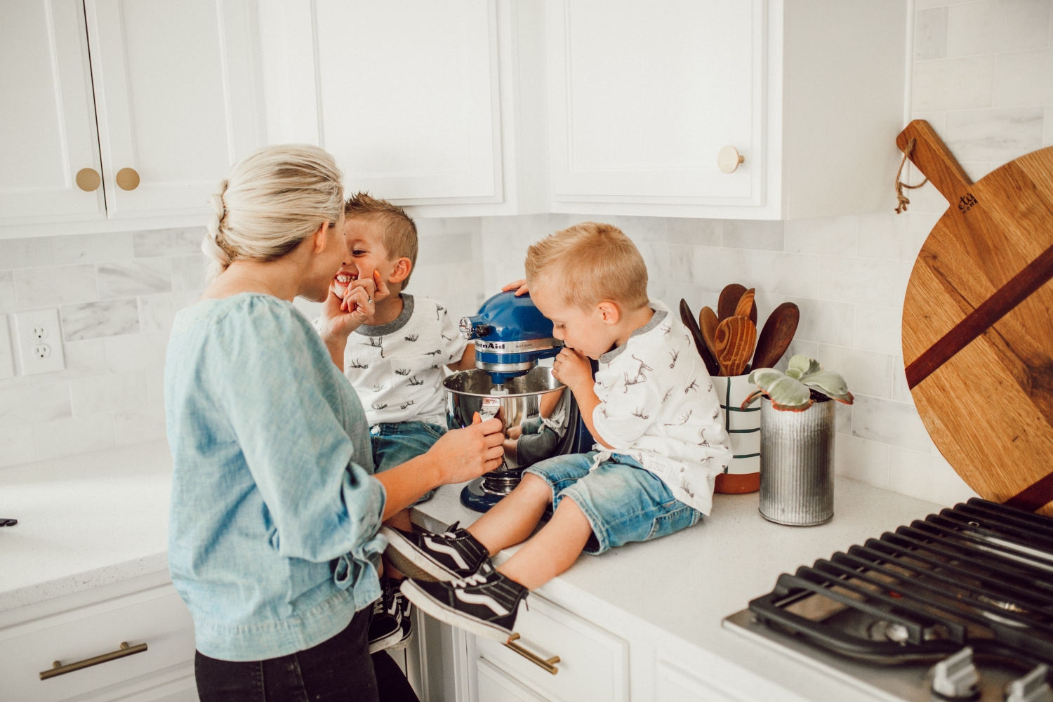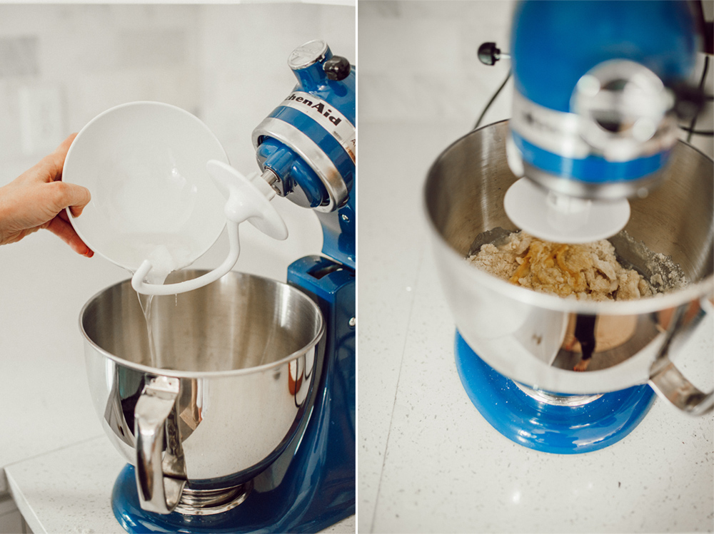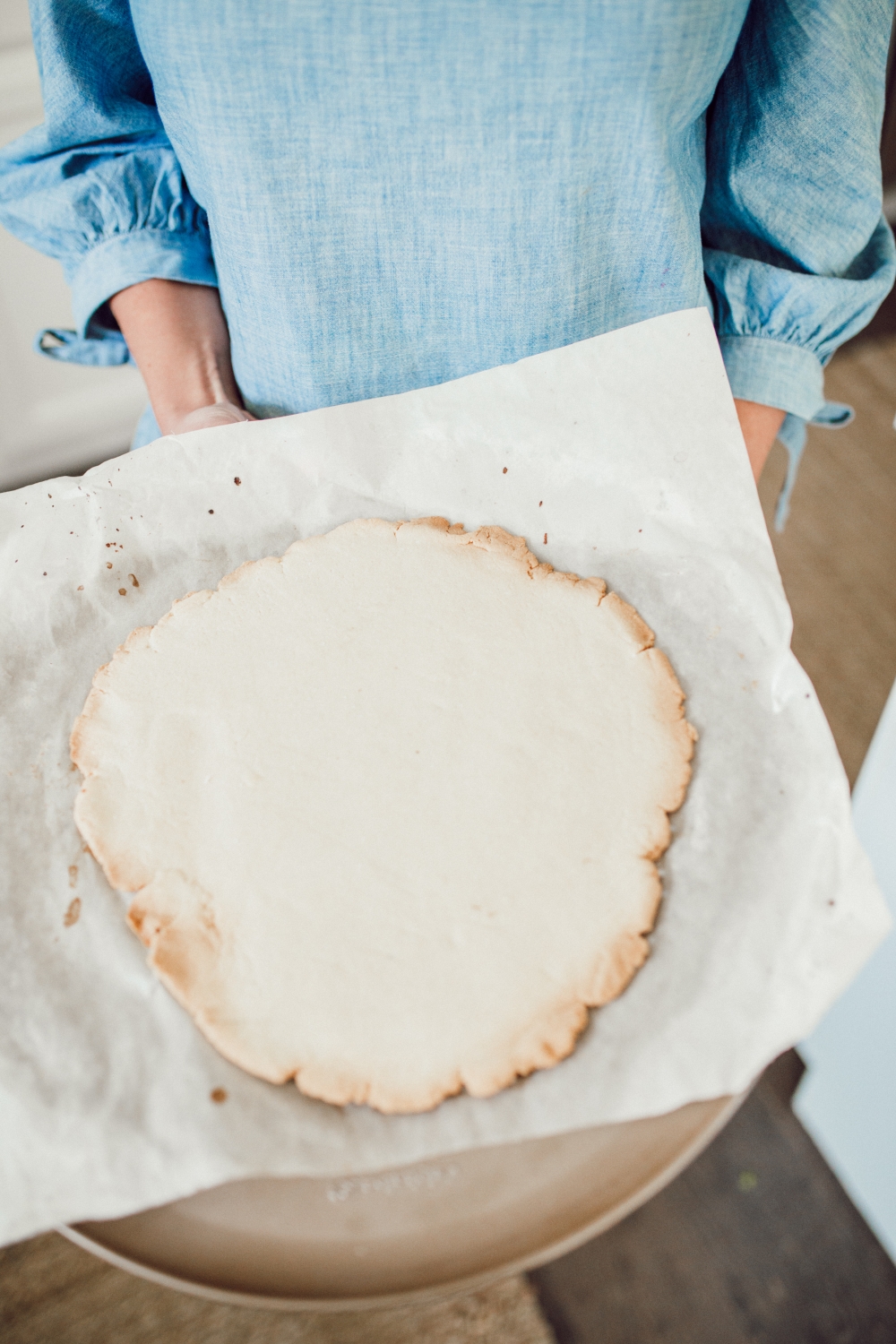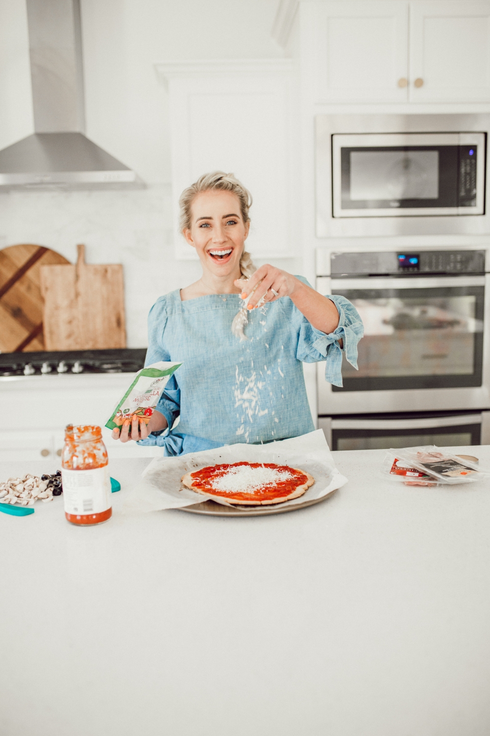The crust is seriously so easy to make that I let my boys hop up on the counter and help me mix in all the ingredients. If you’ve ever made home made pizza dough before you know it’s quite the process. It’s pretty finicky + you’ve gotta let it sit in the fridge for hours. This dough takes less than five minutes to make and you’re done so if time is of the essence, this would make a great meal!