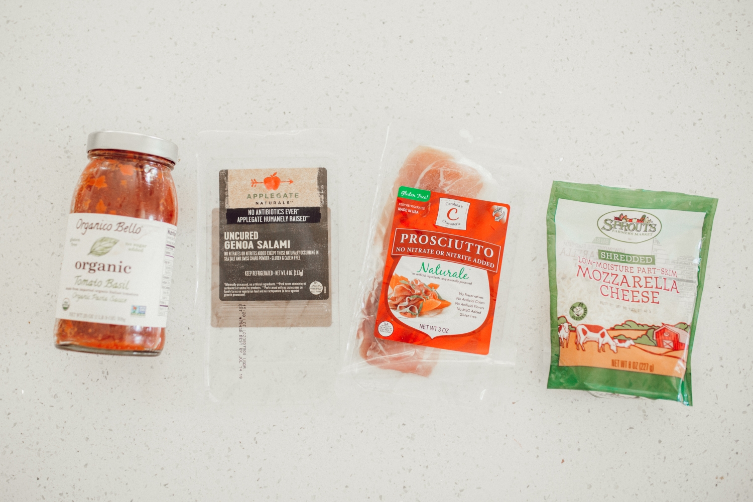 Once your crust is golden brown, take it out of the oven and then put on your favorite toppings. We really love salami, prosciutto, fresh arugula, olives, mushrooms, pepperoni, peppers and of course lots and lots of mozzarella cheese. One of the main reasons I loved keto — what other diet tells you to eat all the cheese you want? And then I just found this pizza sauce at our local grocery store and it has zero added sugars but use what you like!