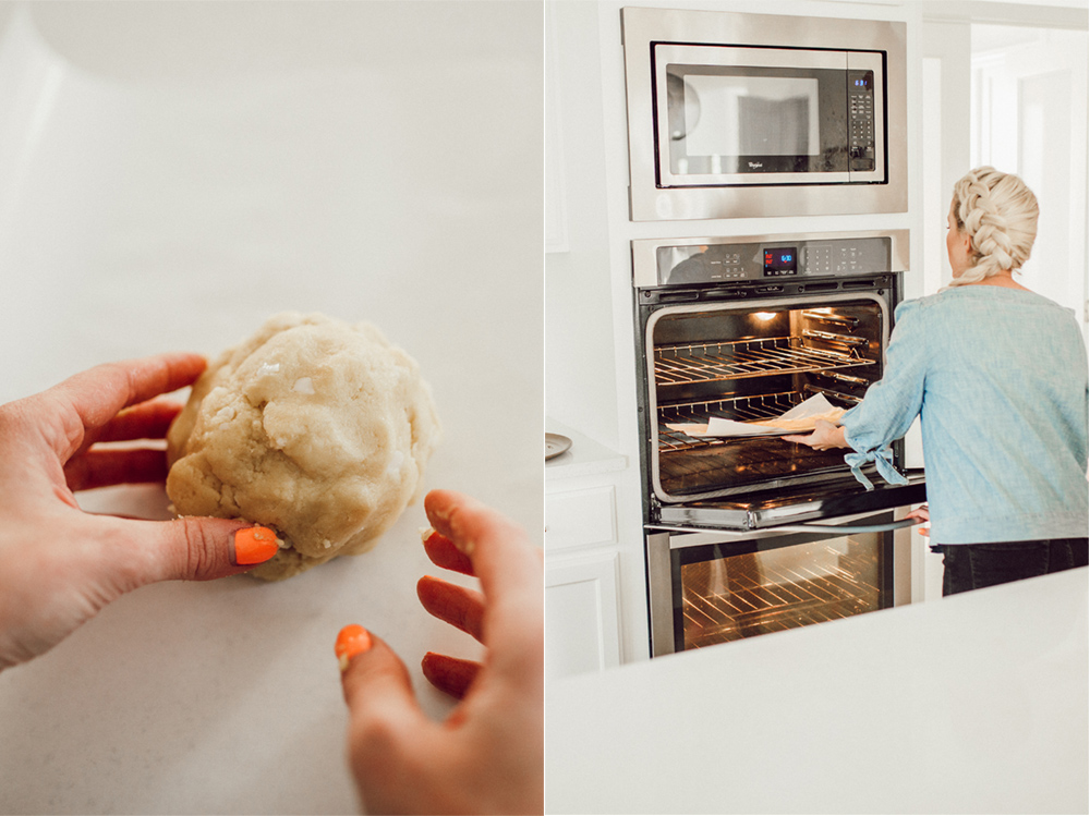 3. Compact dough into a large ball and then place between two pieces of parchment paper